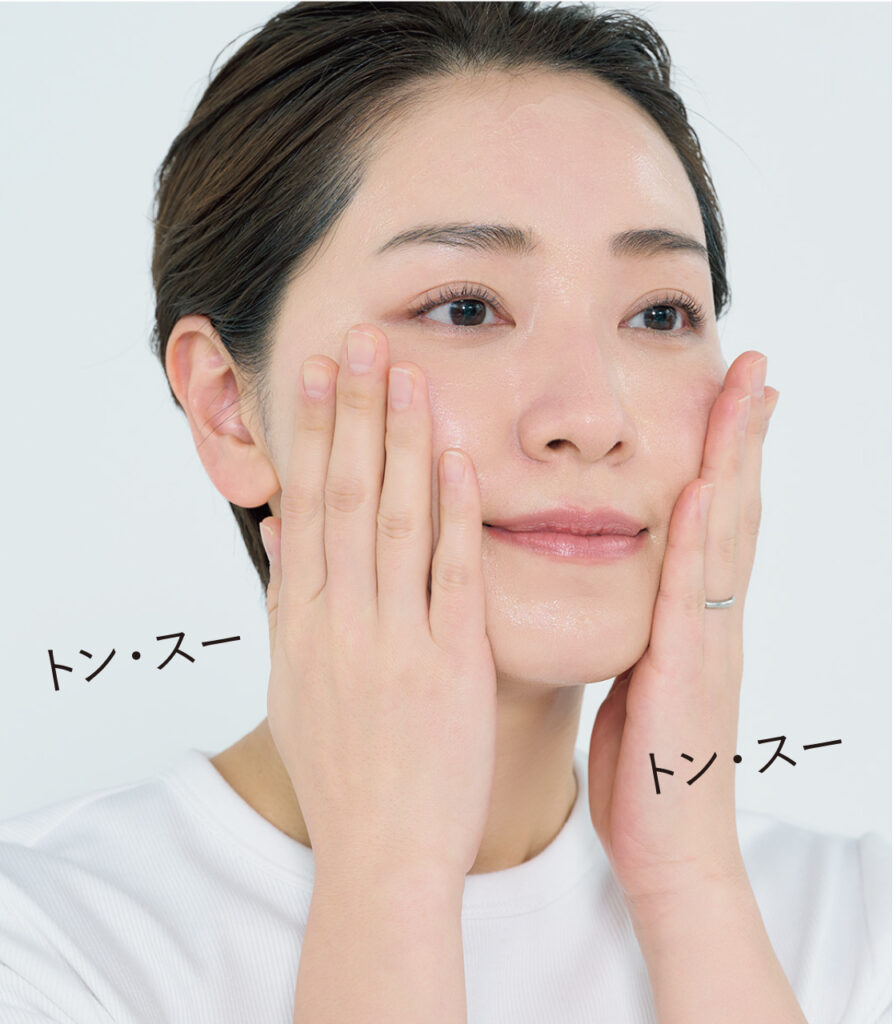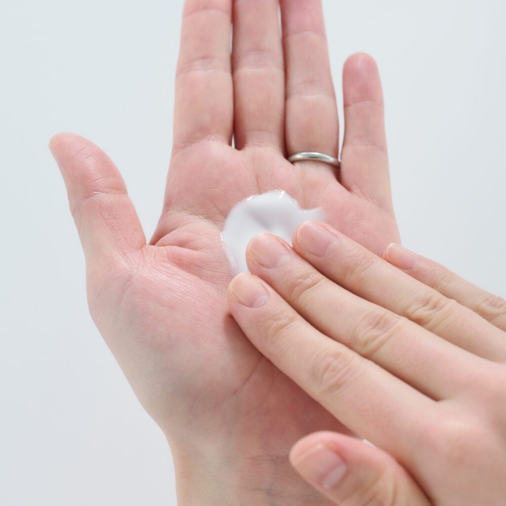ゆらぎ肌に禁物な、むやみにこすり落とすタッチ。クレンジング剤を温めてからスローモーションで顔全体にいきわたらせると、摩擦負担をかけることなく、手ぎわよくメイクを落とせますよ