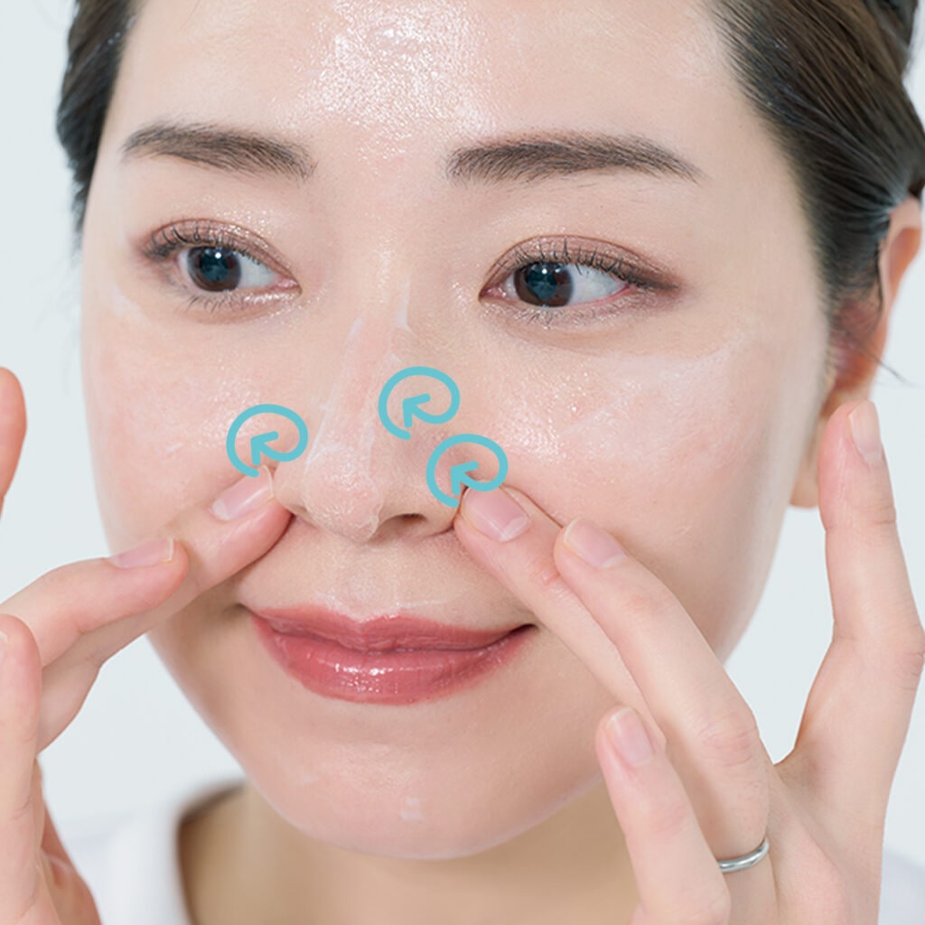 毛穴にメイクがたまりやすい小鼻は、少しずつ位置をずらしながら中指で小さな円を描き、丁寧に汚れを浮かし出して。
