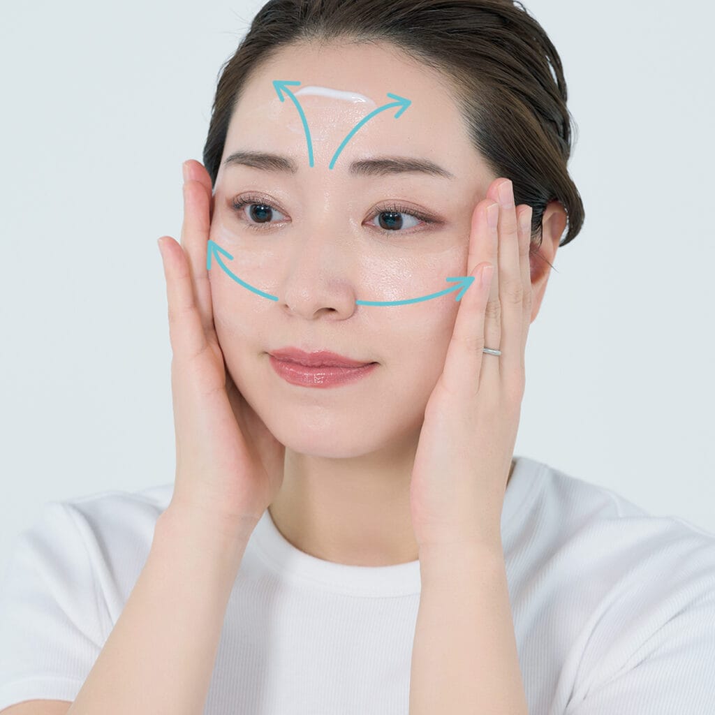 急いで手を往復させると肌に負担! スローモーションで内から外へと一方通行でメイクとなじませ、物理的な手の力ではなく「クレンジング剤の力」でメイクを浮かせる。