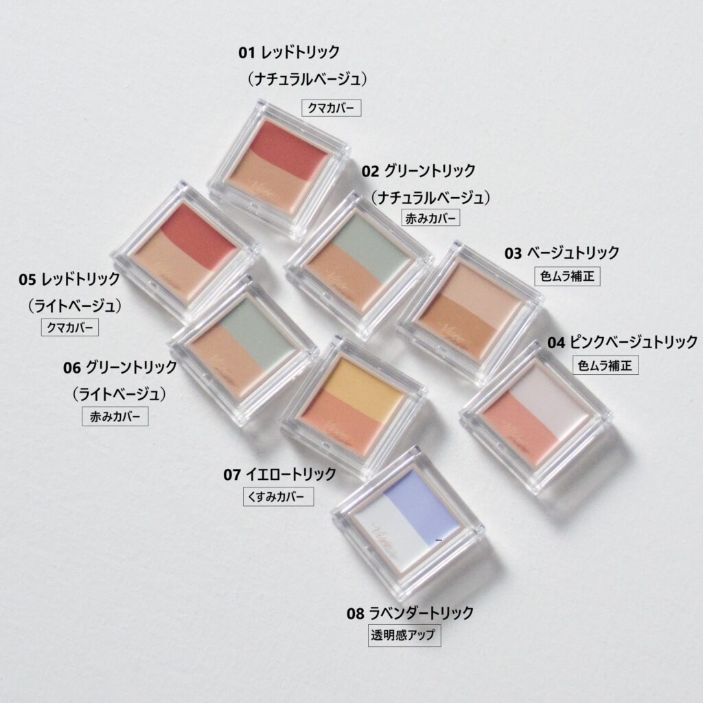 クマをカバーする「レッドトリック」、赤みをカバーする「グリーントリック」、色ムラを補正する「ベージュトリック」など、肌悩みに合わせて選ぶことができます。
