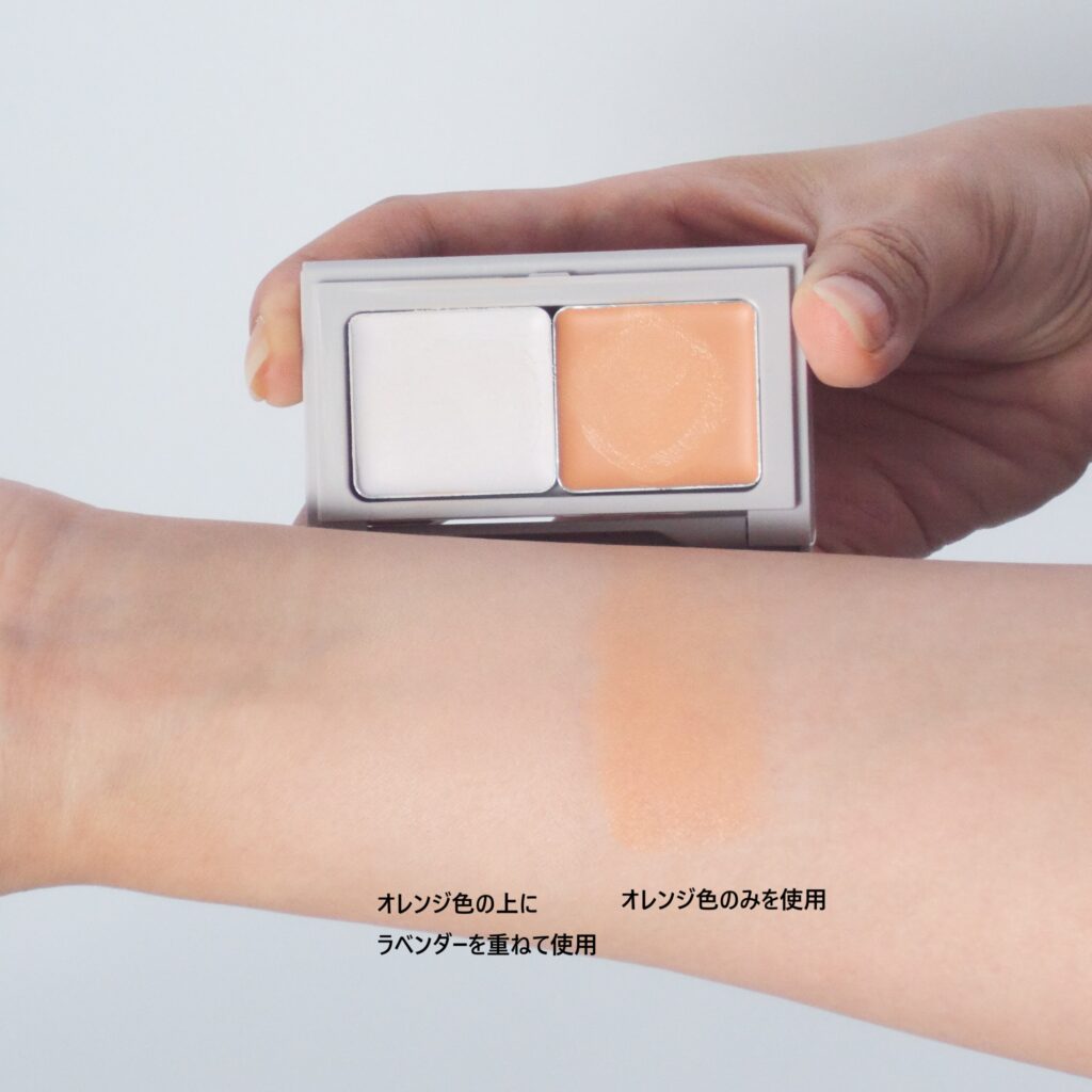 あらゆる気がかりを隠してくれるオレンジ色と、オレンジ色を肌色に近づけながら透明感も出してくれるライラックを、自分の肌色に合わせて自由に調整できるから、隠しているのがわからないような自然な仕上がりに。