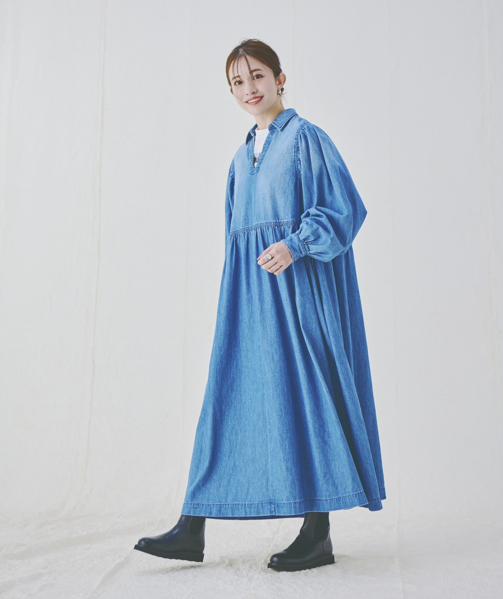 素材はコットン100%のライトオンスデニム。生地を贅沢に使いながらも軽い着心地です。顔まわりがすっきりと映るスキッパー衿にボリューム袖、そして胸下切り替えからふわっと広がるシルエットのバランスが秀逸で、二の腕やおなかまわりなど、大人が気になるパーツをおしゃれにカバーできます。インナーや小物使いでアレンジが楽しめるところも魅力的。