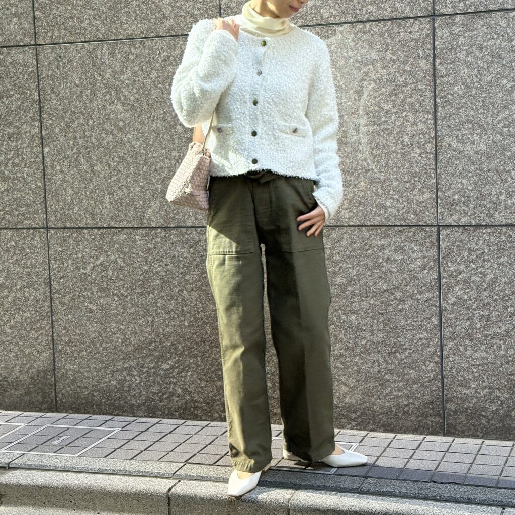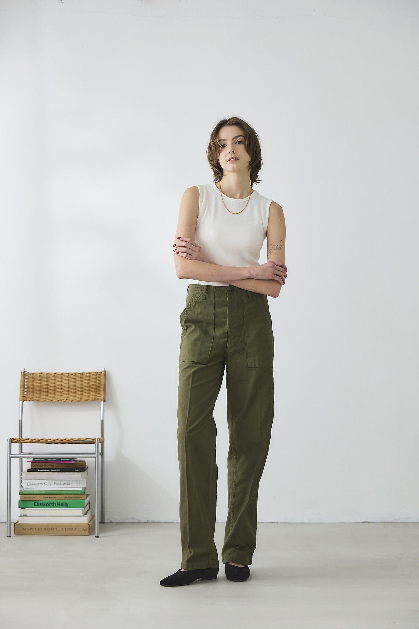 60年代のヴィンテージパンツを思わせる本格派のベイカーパンツ。すっきりとしたストレート型やヒップポケットをあえて高い位置につけるなど、すらっと見える工夫も満載。前にも後ろにも備わった大きめのポケットが、気になる腰まわりをおしゃれにカバー。深みのあるオリーブグリーンのかっこよさを生かし、潔く黒とシックに着こなしても素敵!