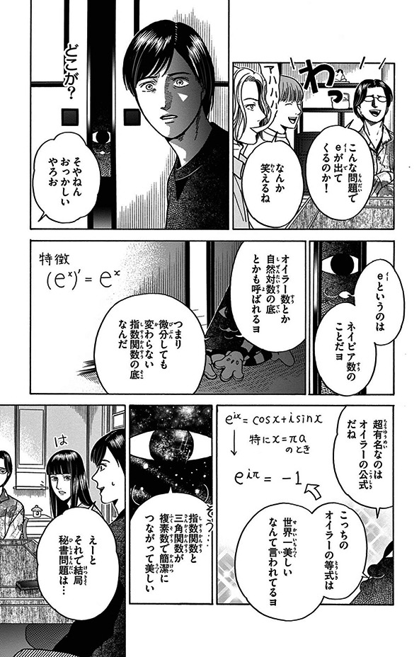 解説ページに理解が追いつかないこともよくありますが(笑)、難解な話になると補足コメントをくれる謎キャラクターの登場も(可愛い)。テンポのよいかけ合いがおもしろく、心に響く言葉もたくさん。建己がつぶやいた「数学って不思議だ 今まであった概念を抽象化して定式化したりすると また新しい数学の扉が開けるんだから」というセリフにもぐっときてしまいました。数学を学ぶ人たちが尽きない扉を開け続けていくのだと思うと、きっとその先に広がる景色は壮大で、言葉にならないほど美しいはず。