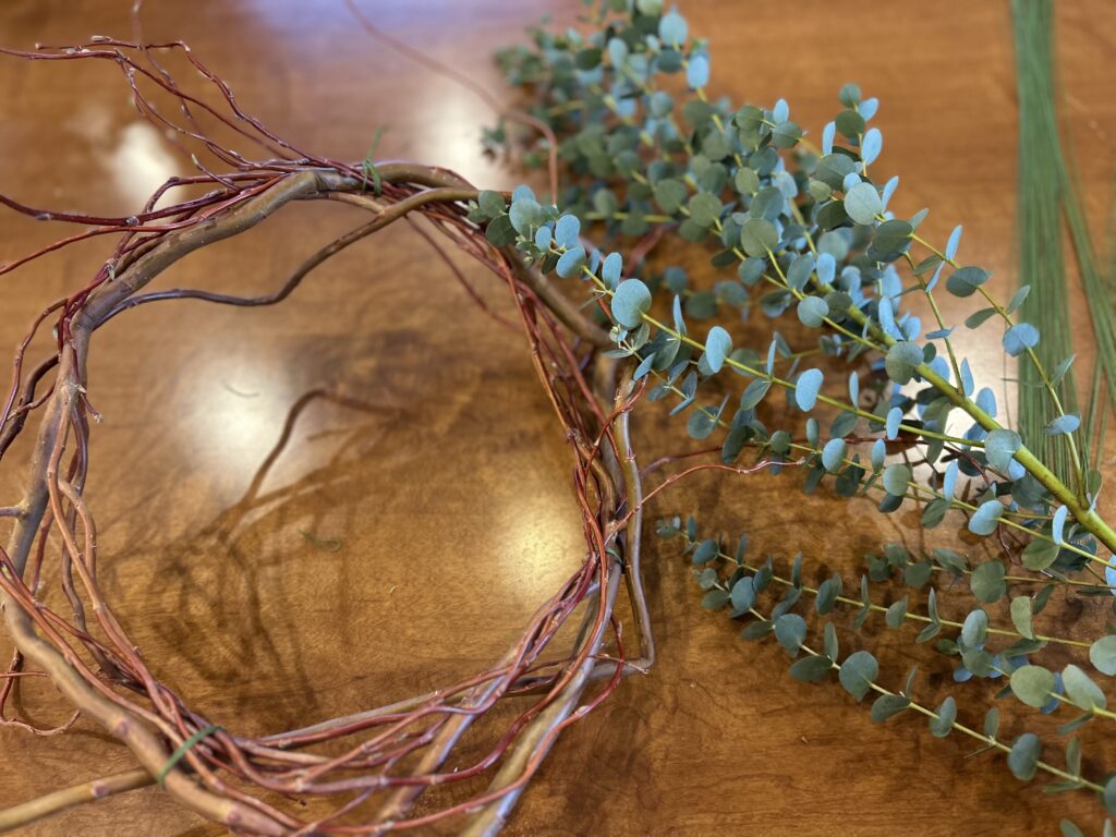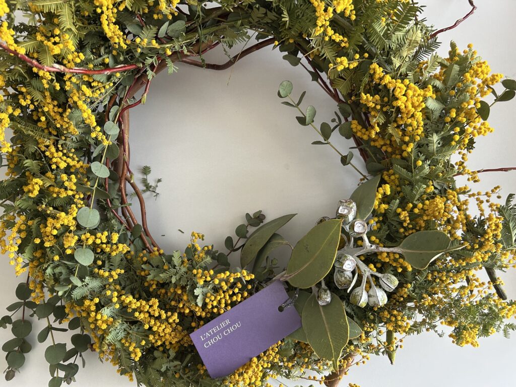 ふわふわの黄色がかわいらしい、ミモザのリースを作りました。