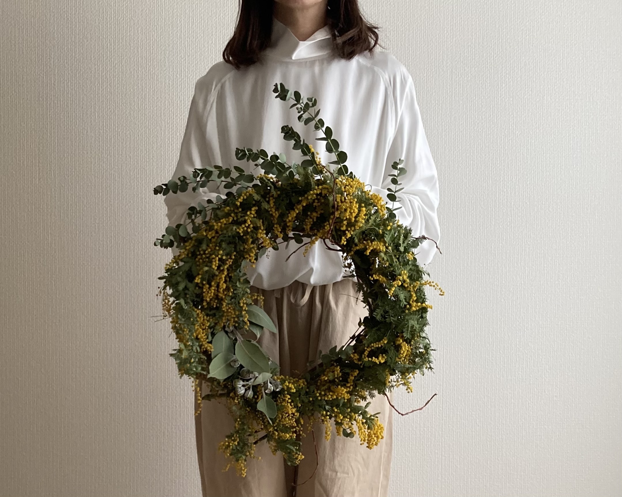 春コーデといえば軽やかなブラウスが着たくなります。店頭にもいろいろなブラウスが登場していて、選ぶのも楽しい!今季は今まで持っていなかったハイネックデザインのブラウスを購入しました。今日は春ブラウスコーデと手作りしたミモザのリースをご紹介します。