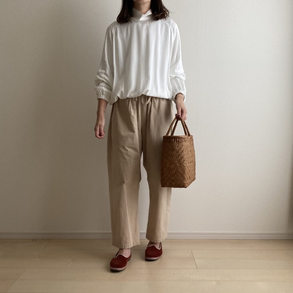 春夏ヘビロテのベージュパンツとSciuscià(シューシャ)の靴を合わせて。こちらもウエストインしていませんが、裾ギャザーでインしているように見えます。