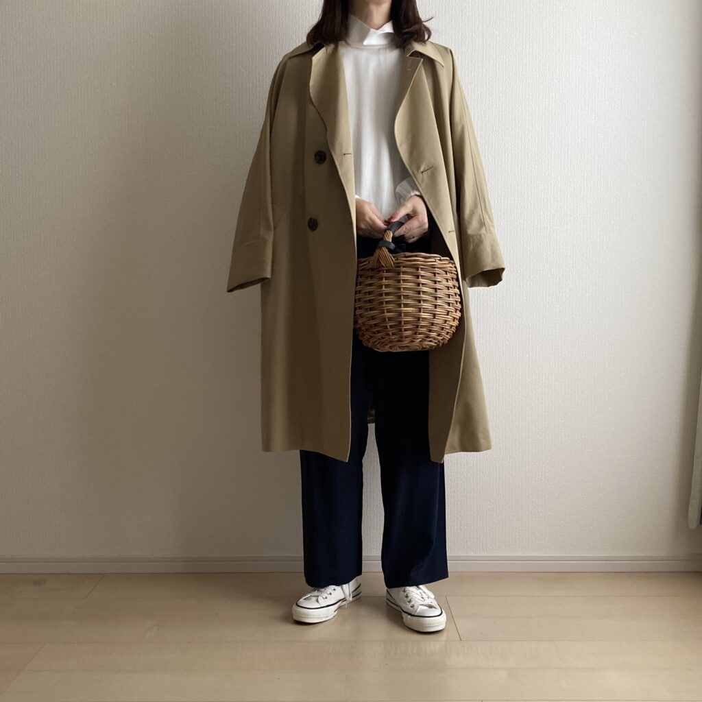 春もたくさん着たい、LEEマルシェで購入したTICCA (ティッカ)のトレンチテントコート。トレンチコートから白のハイネックが見えるのが好きなのです。ブラウスの絶妙な光沢感で大人っぽく見えるといいな。
