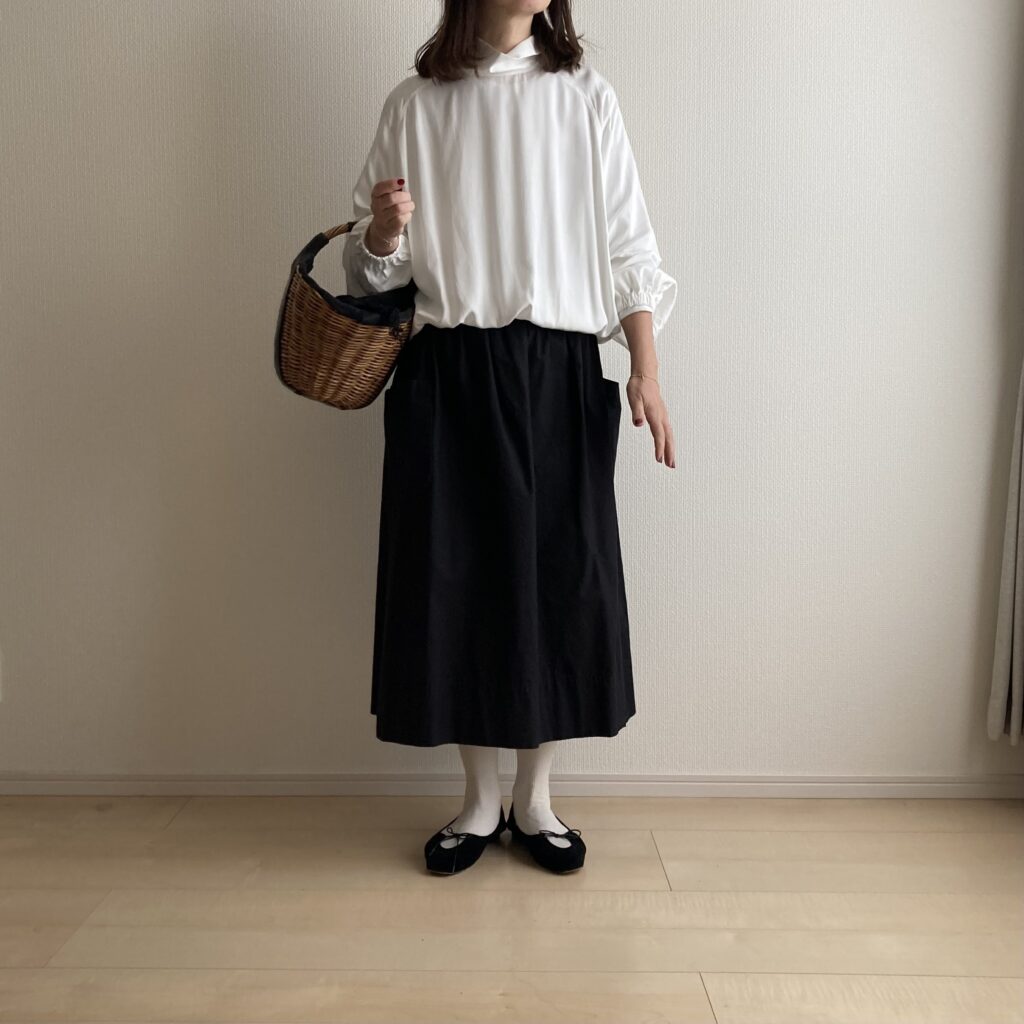 フェミニンなブラウスとスカートを合わせると甘くなりすぎるかなと思いましたが、モノトーンだとスッキリ見える気がします。