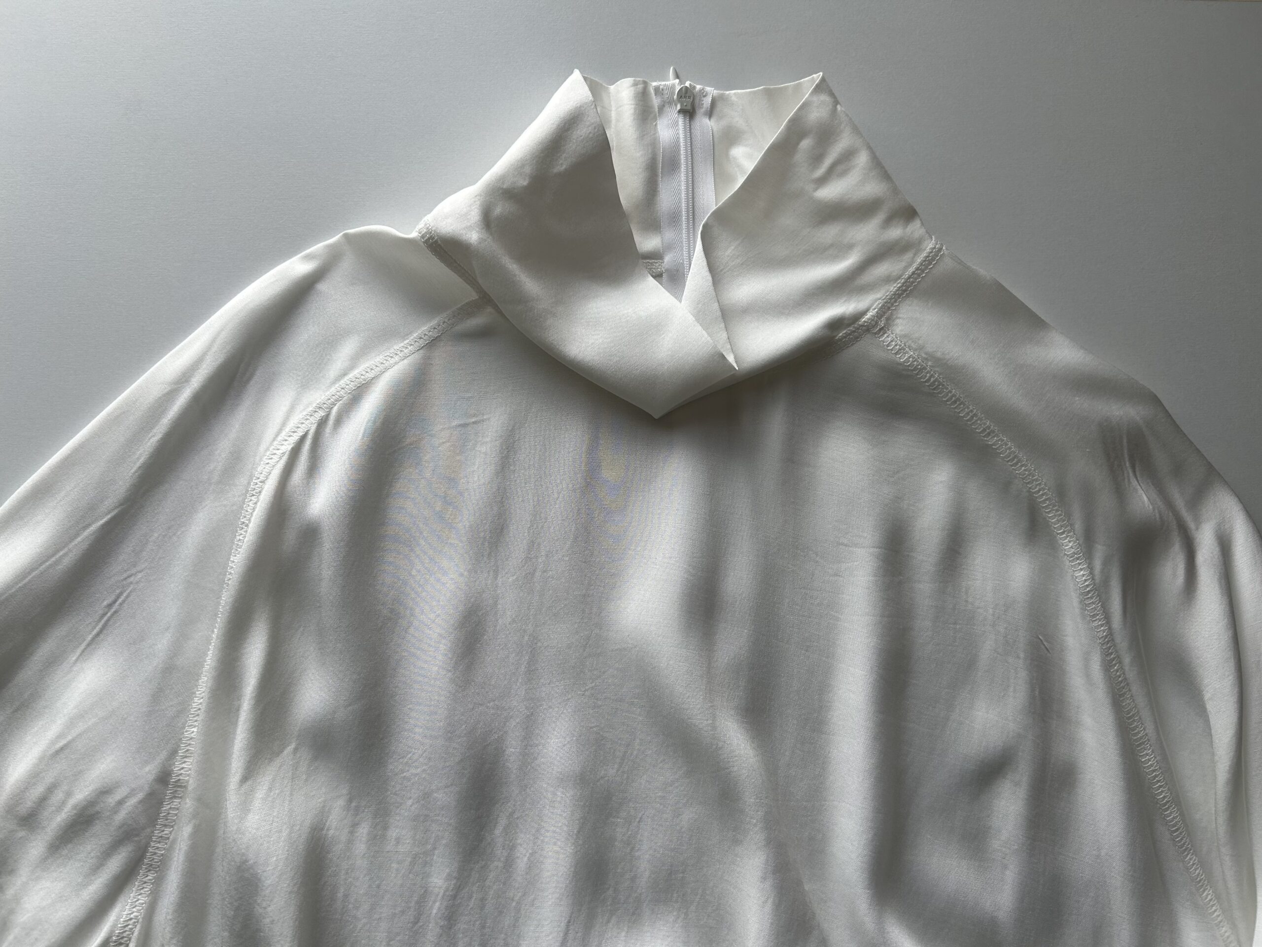 ハイネック、ラグランスリーブのふんわり袖、身幅はゆったりで落ち感のある素材感……と好きな要素ばかりのデザイン。