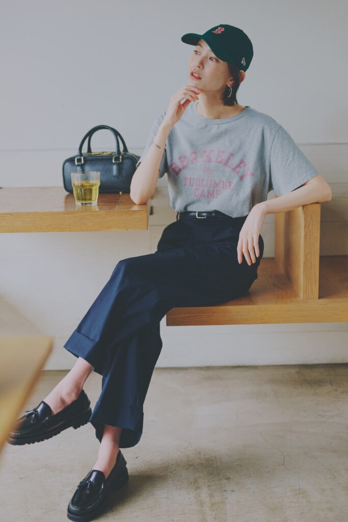 霜降りグレーのTシャツにプリントされたのは、カレッジ風のロゴ+ネコの柄。プリント部分の赤がいい感じに退色しているので、ロゴが主張しすぎることなく、いつものコーデにすんなりなじみます。ブランドオリジナルのスペシャル加工により、衿ぐりや袖口などには自然なダメージ感が。センタープレス入りのパンツやタッセルローファーといった、きちんと感のあるアイテムを合わせ、軽やかなプレッピーコーデを楽しんで。