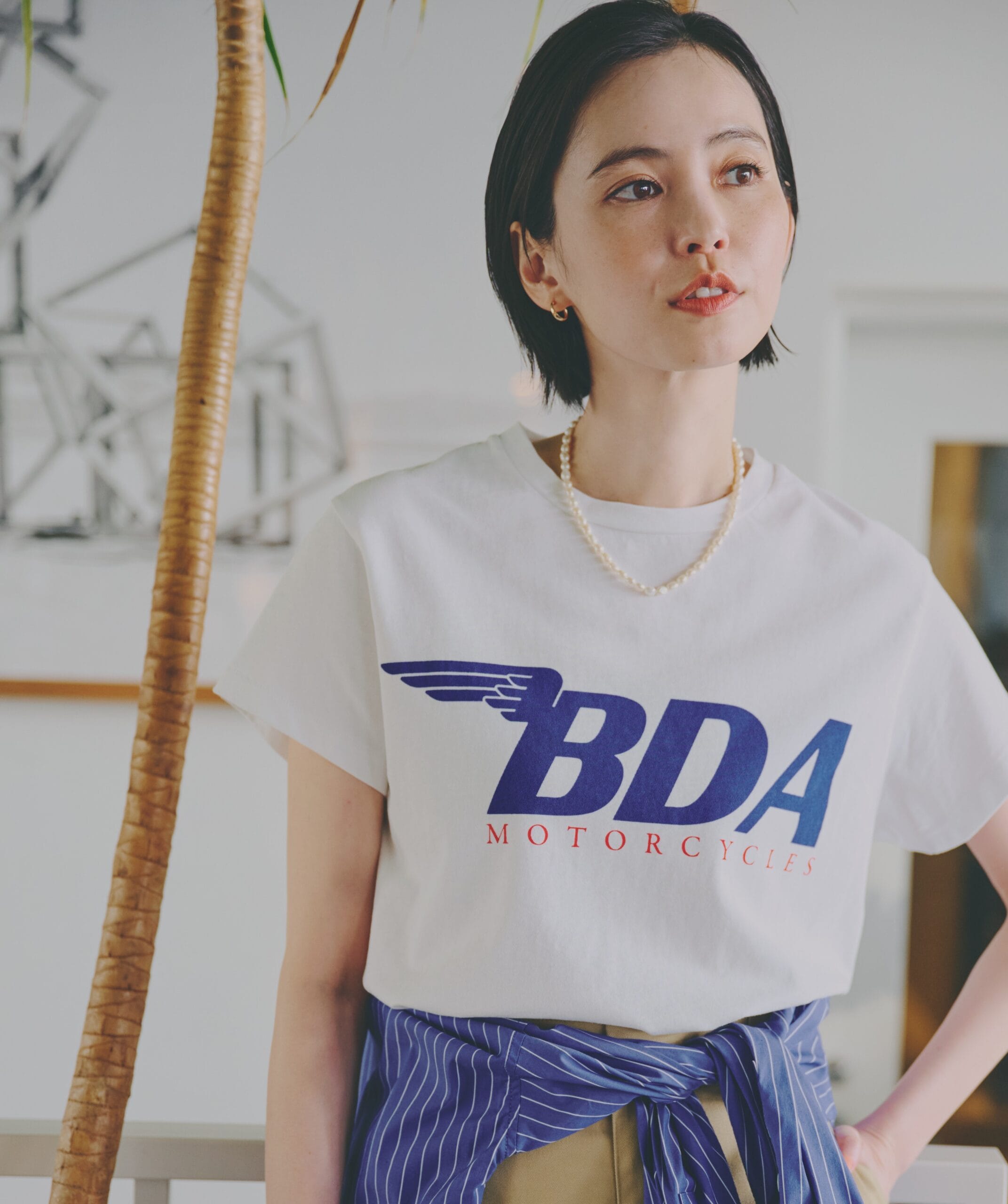 クリーンな白Tシャツに映える、鮮やかなブルーと赤のロゴ。オブラダが得意とする車やバイクの絵柄をプリントしたTシャツは、90年代のムードが漂う、ややコンパクトなサイジングが魅力です。着丈と袖は短めで、身幅にはゆとりがあるため、着心地のよさは文句なし。シャリっとしたコットンの質感が、夏のおしゃれ気分を盛り立てます。タックアウトでも決まる丈感ですが、裾イン&パールネックレスできれいめに着こなすのも手。
