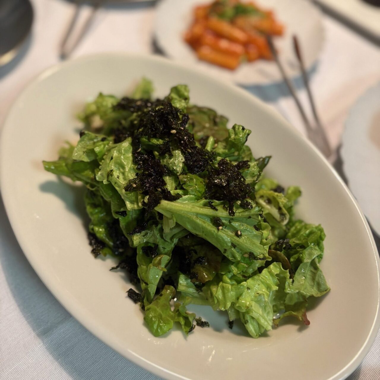 サニーレタスを、ろく助の塩とごま油で和えて、米酢を少し。仕上げに韓国のりをたっぷり散らしただけのシンプルなチョレギサラダ。「これ、いくらでもいける!」(姪っ子談)。