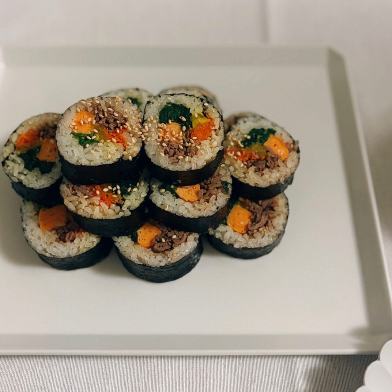 カルディの購入品以外で、キンパとチョレギサラダを作りました。韓国料理と聞くと辛い物のイメージが強かったのですが、甘辛バランスが調度よいメニューになったと思います。