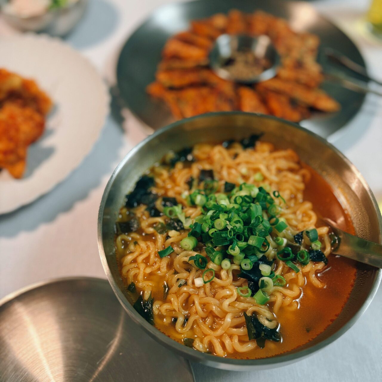 海鮮だしスープの韓国のインスタントラーメン。通常のものと、辛さがマイルドなもの2種類用意しました。モチモチ食感の麺は、ラーメンよりもうどんに近いかな?と思います。