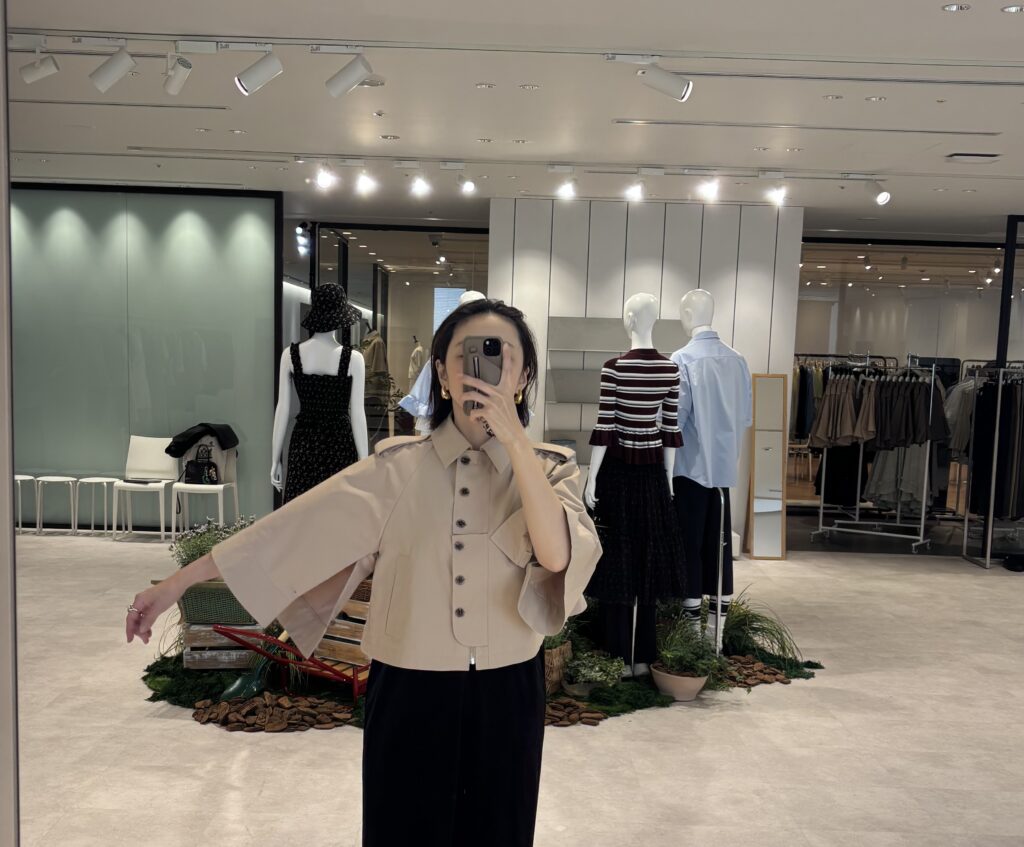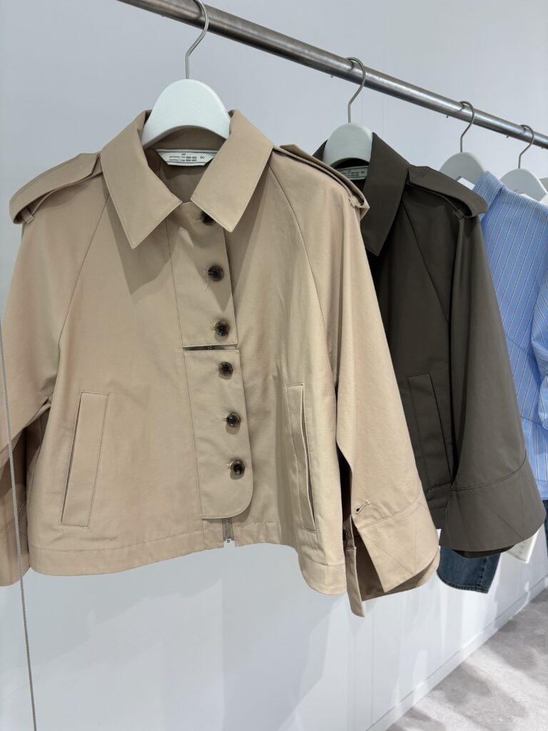 アウター部門では、ボタンディテールとAラインシルエットが魅力のショートケープコートをピックアップ。こちら、袖のボタンを開けてケープ風の着こなしが楽しめるのが最大の魅力です。