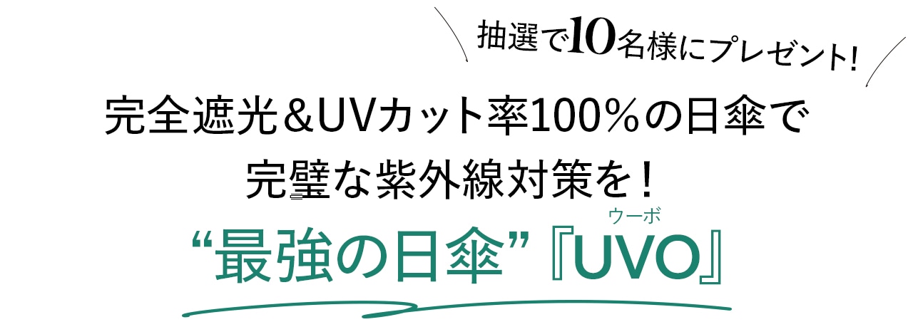 「UV0(ユーブイゼロ)を実現する」という意味をもつ「UVO(ウーボ)」 。肌を紫外線からしっかりと守り、「絶対に日焼けしたくない」という願いを叶えるべく開発された、”最強の日傘”です。