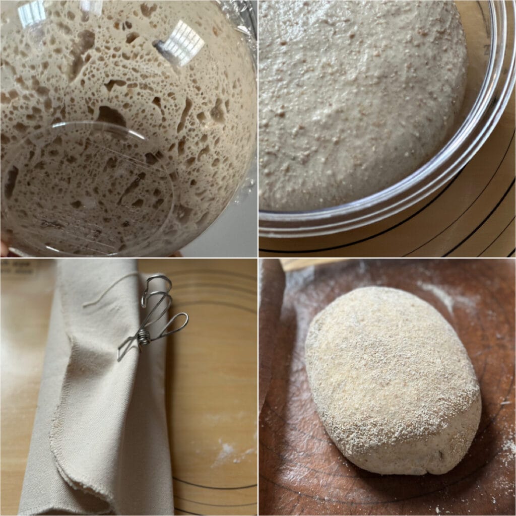 いろいろな作り方があると思いますが、私は途中冷蔵庫で発酵させます。冷蔵庫から出して復温させ、一次発酵が終わった時には、生地にたくさんの気泡があることがわかります(左上)。ふっくらと膨らんだ生地を取り出して成形するのですが、出来た気泡を潰さないように細心の注意を払います。この気泡が、穴がポコポコ空いたカンパーニュを焼く決め手になるそうです。