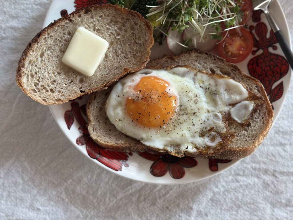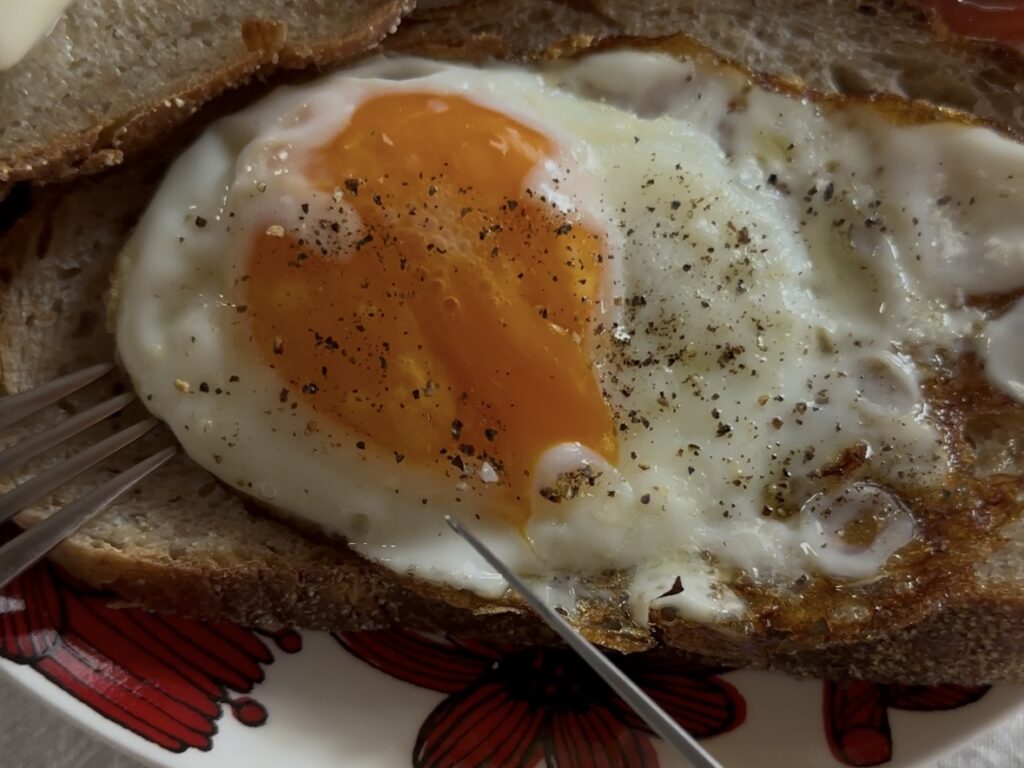 この日は目玉焼きをのせただけの、シンプルなオープンサンド(『天空の城ラピュタ』に出てくる、いわゆる「ラピュタパン」は食パンです)。半熟に焼いた目玉焼きをナイフでカットすると、黄身がとろ〜んと流れ出すところもたまりません。