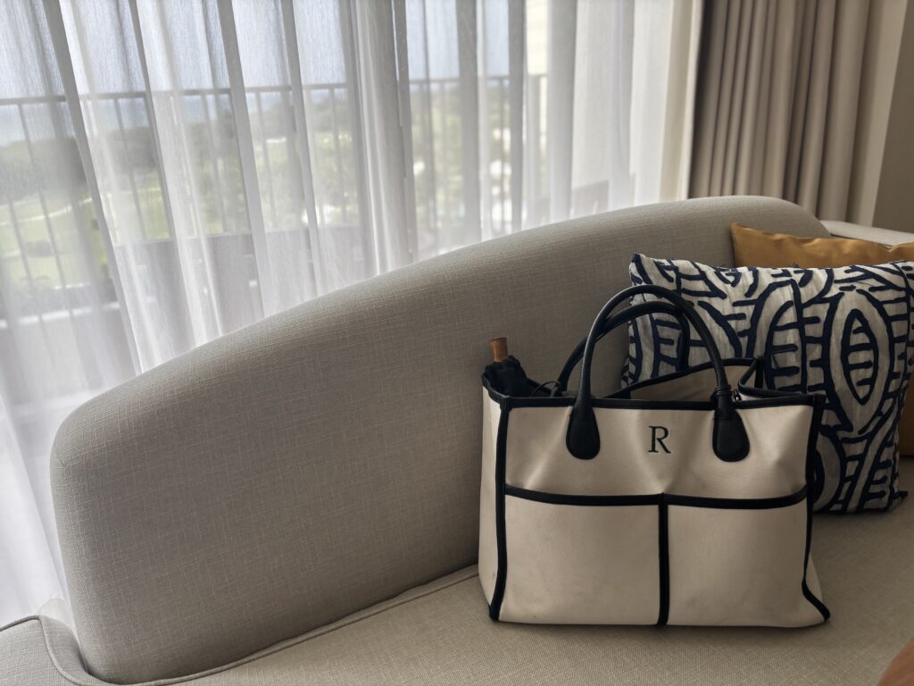 機内持ち込みのバッグは「ナパ」のイニシャル入りトート