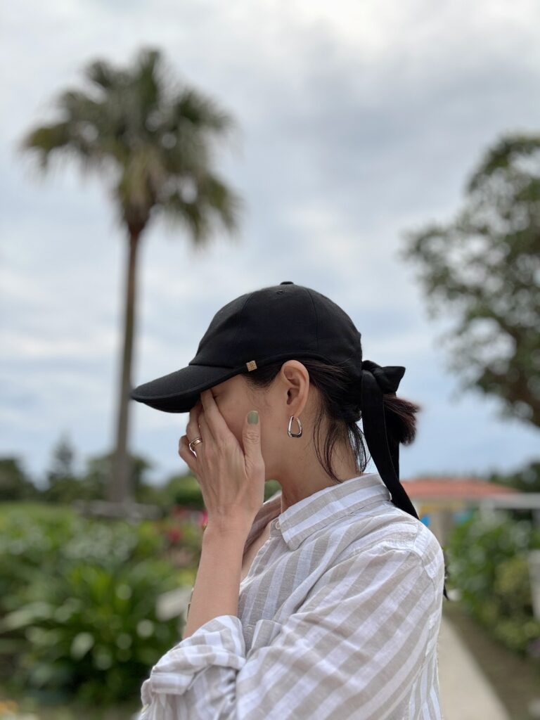 「CA4LA」で新調したキャップはコットン100%の生地ながら程よい光沢としなやかさがあって、カジュアルすぎず、どこか品のある雰囲気に。