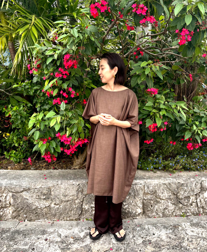 街歩きをするときは「THE ROW」のワンピースに「ワークマン」のパンツを穿いて。同系色でワントーンコーディネートを楽しみました。