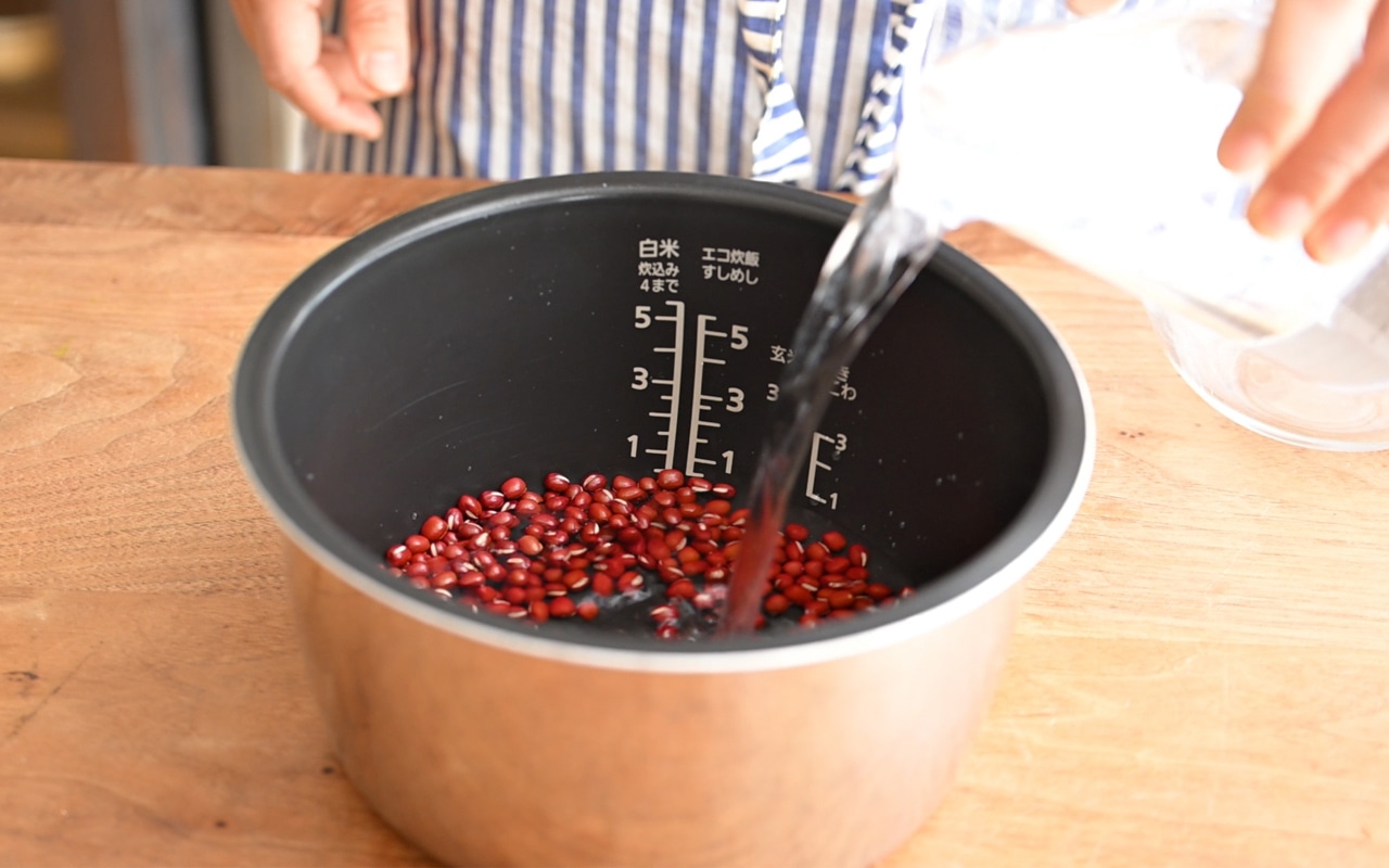 - 小豆をさっと洗い炊飯器の内釜に入れ、水を3合の目盛りまで入れて通常モードで炊く。