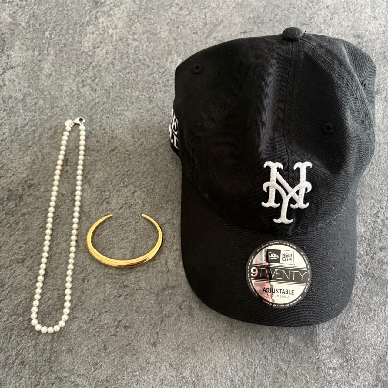 ネックレスはゴールド系を合わせようかな?と思いましたが、ロングパールで「白」をプラスしてキャップのロゴとリンクすることで、まとまりのあるコーデに仕上がりました。