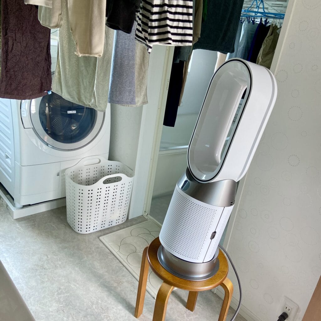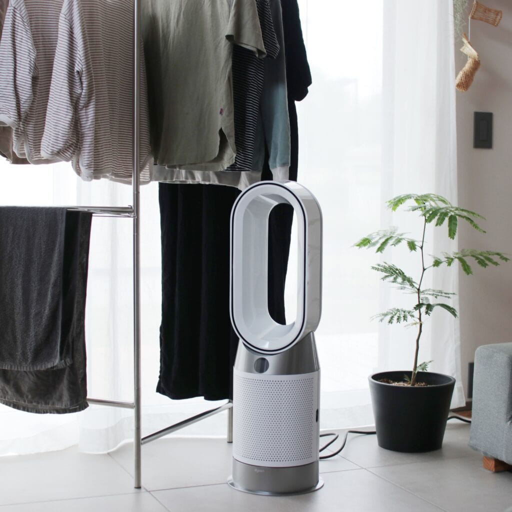 梅雨時の部屋干しには扇風機やサーキュレータ―を使う人が多いと思いますが、ダイソンのホット+クール空気清浄機(HP10)はそれとは別格の速乾性があります。というのも、単に風量が多いというだけでなくヒーター機能が搭載されていて“温風”が出るから。髪を乾かす時も送風(冷風)ではなかなか乾かないけれど、温風+大風量だとスピーディーに乾きますよね。それと同じことです。わが家にも旧モデルがあるので使ってみたら、衣類乾燥除湿機にも負けない乾燥スピードにびっくり。