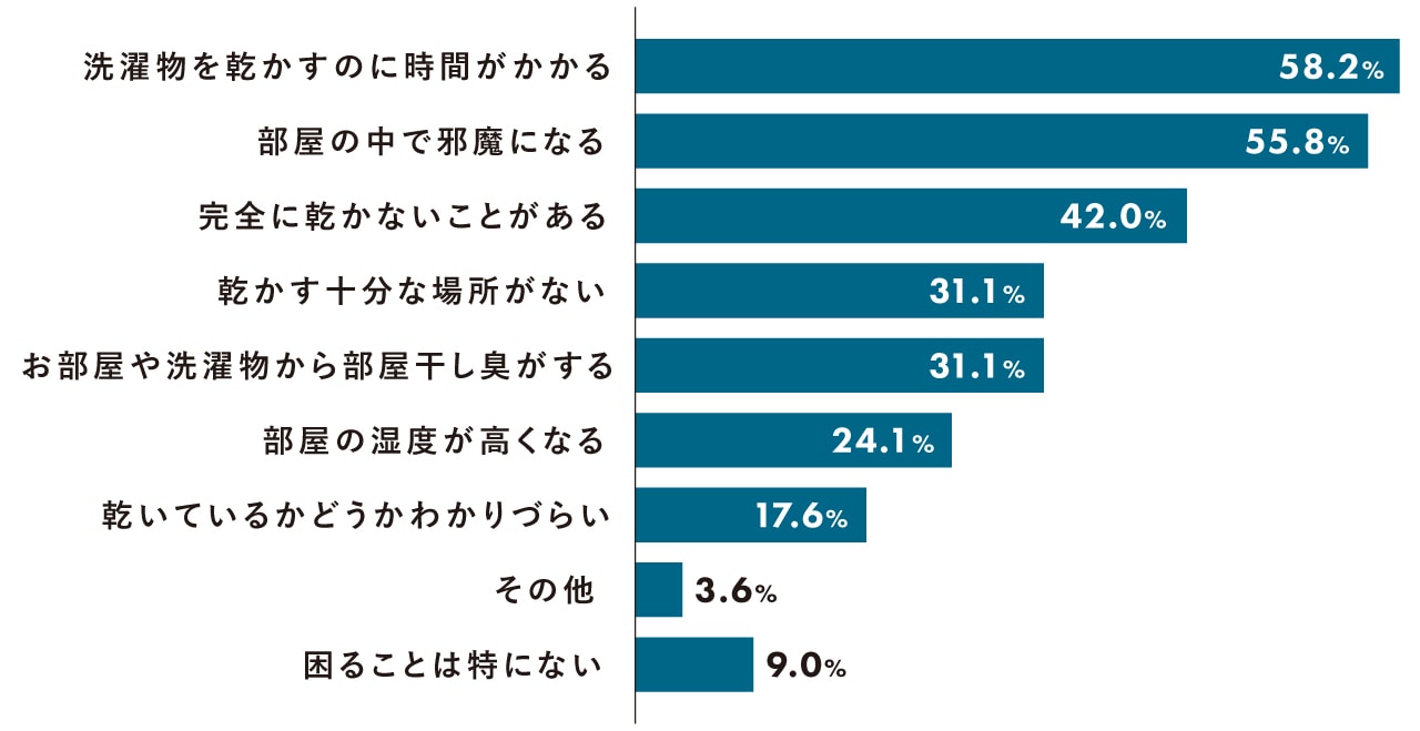 トップの「洗濯物を乾かすのに時間がかかる」をはじめ、部屋干しには、ストレスを感じる要素がいろいろです。「部屋の中で邪魔になる」も短い時間で乾かせれば、そこまで気にならないはずなのに!