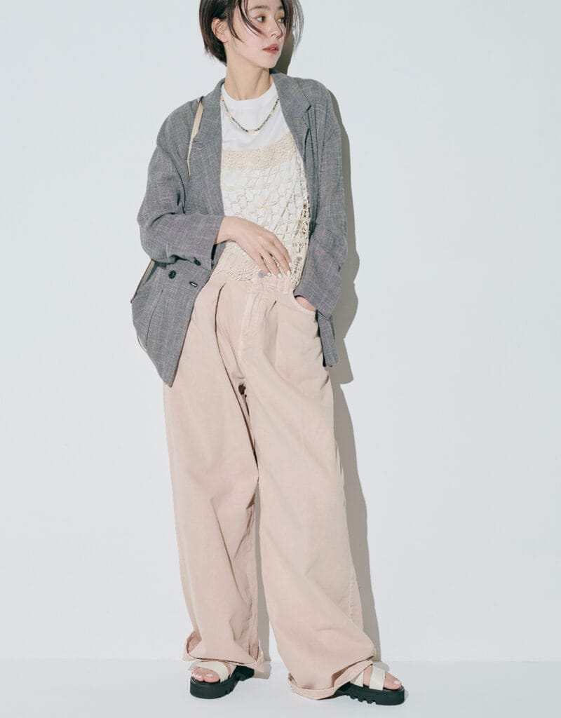 柔らかな質感、驚くほどの軽やかさ、締めつけ感ゼロの設計と、はき心地のよさを極めた上品ワイド。シュガーピンクのシャツを合わせて、旬のパステルコーデを楽しんで。