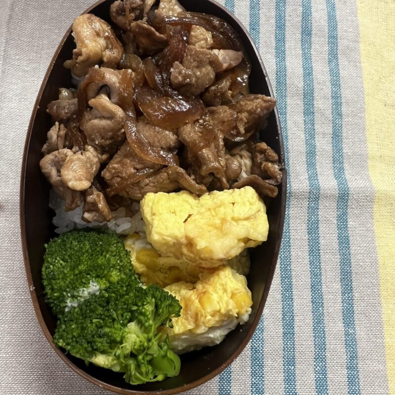 「昨晩の夜ごはんが肉じゃがの、ちょこっとだけお肉と玉ねぎをお弁当用に残し、卵焼き器で炒めて、豚丼弁当の出来上がり!