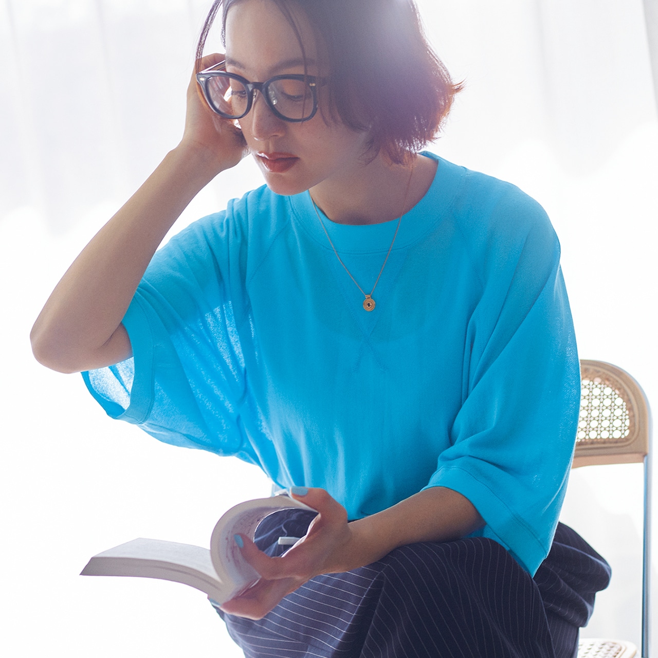 旬のシアートップスを大人っぽく取り入れたいなら、この五分袖Tシャツがイチ押し。スウェットに使われる裏毛に透け感をプラスしているため、控えめシアーでとても上品。鮮やかなターコイズブルーが顔映りをトーンアップし、おしゃれをリフレッシュさせてくれます。二の腕カバーのドルマン袖もうれしいポイント。胸元には目を引く汗止めステッチ入り。
