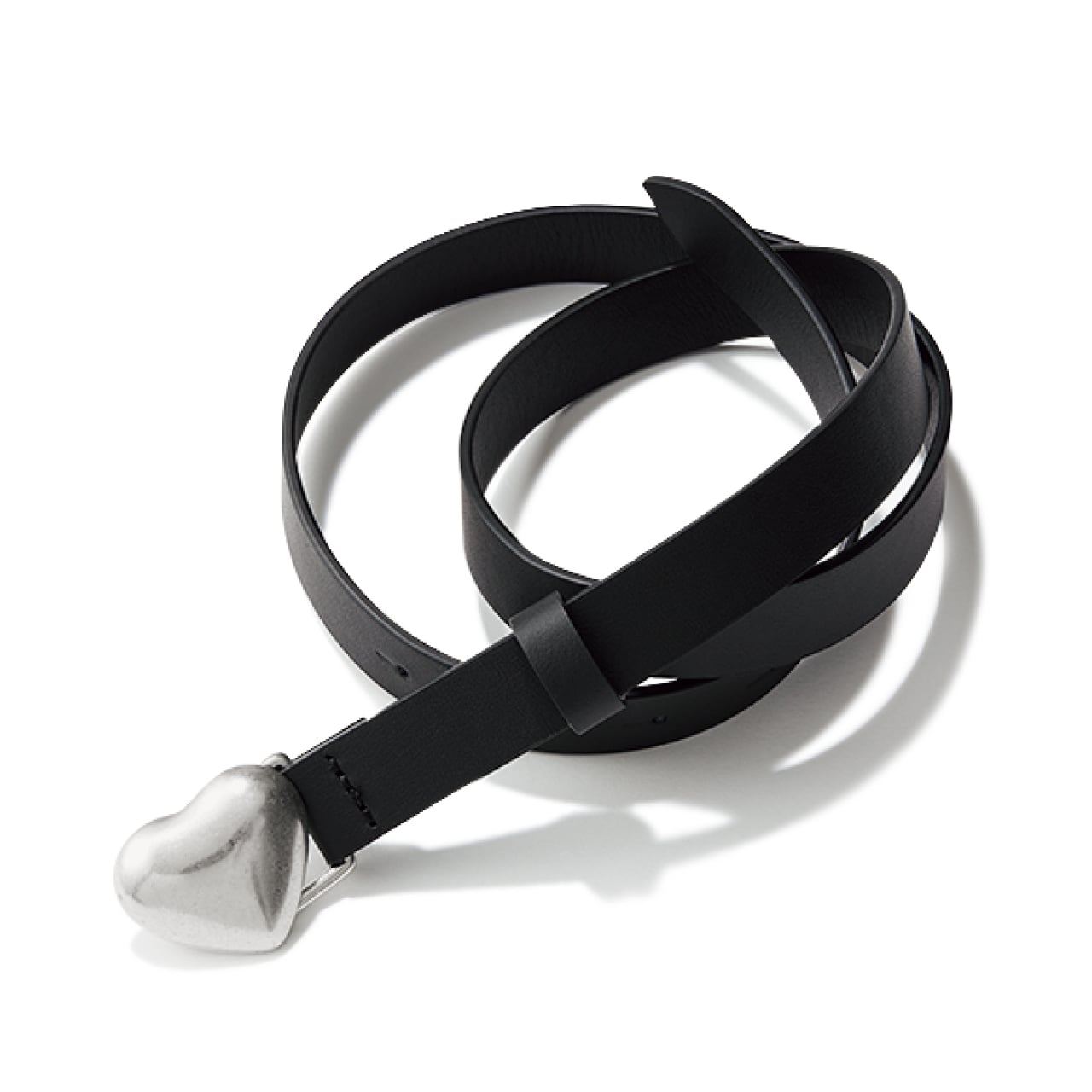 幅細めの黒レザーにハート形バックルがあしらわれたモチーフベルトは、薄着の季節に重宝間違いなし。シルバーかつマットなので、甘くなりすぎずこなれた印象でつけこなすことができます。ワンピースでウエストマークしたり、カーデの上からプラスしても素敵。