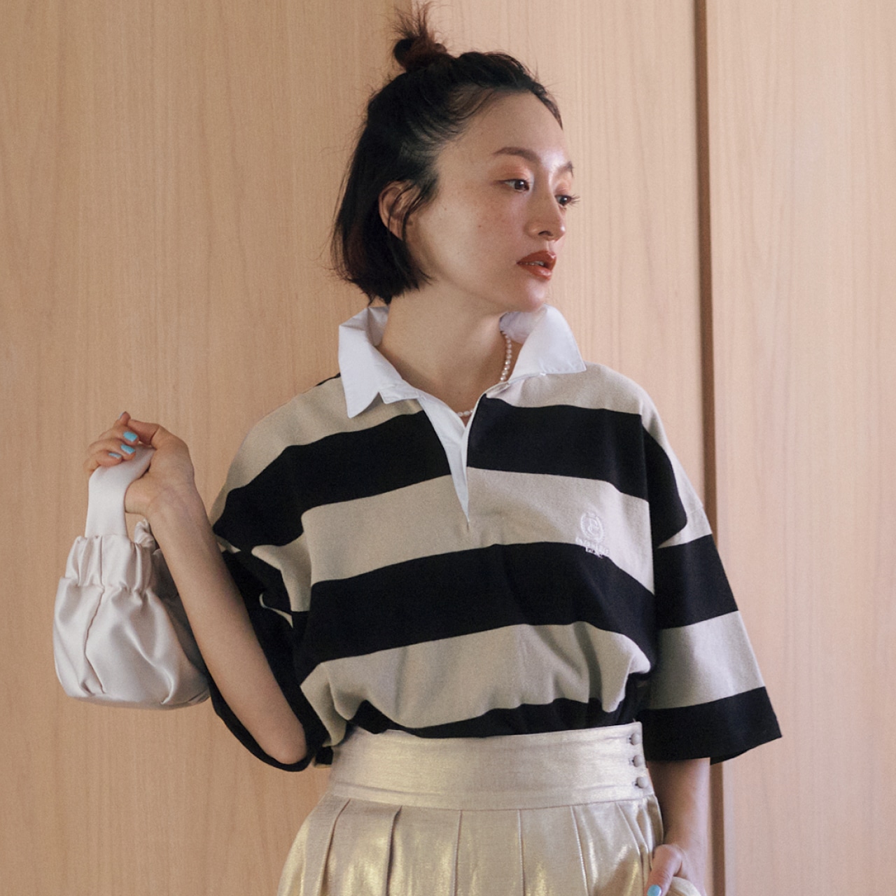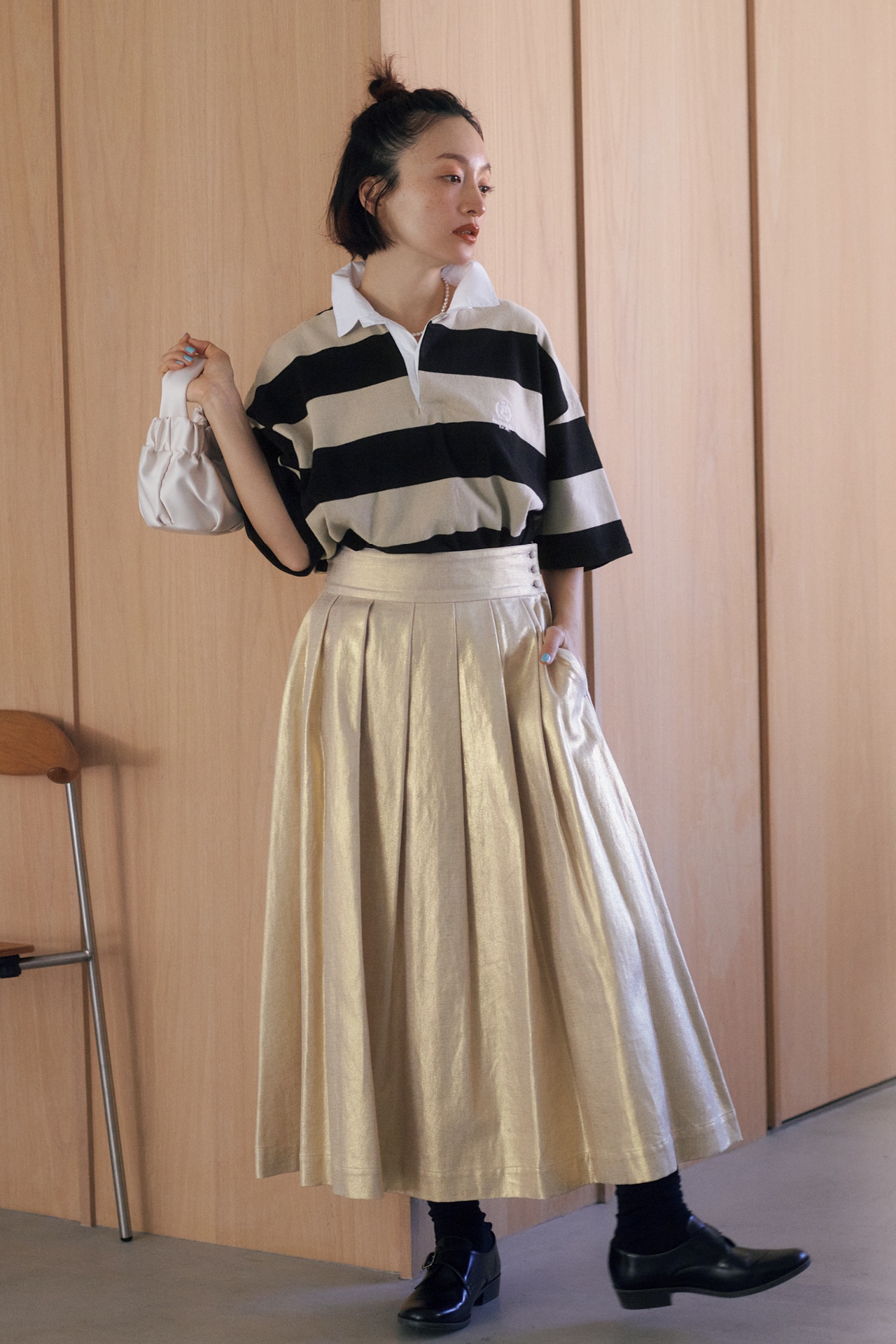 存在感大の太ボーダーラガーシャツは、ゴールドスカートなどのインパクトボトムと合わせてもバランス良好。