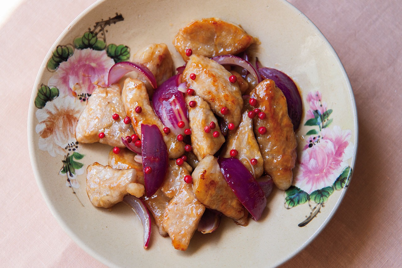 - (3)の玉ねぎに透明感が出たら、合わせたAを入れ、全体にからめる。器に盛り、ピンクペッパーを散らす。