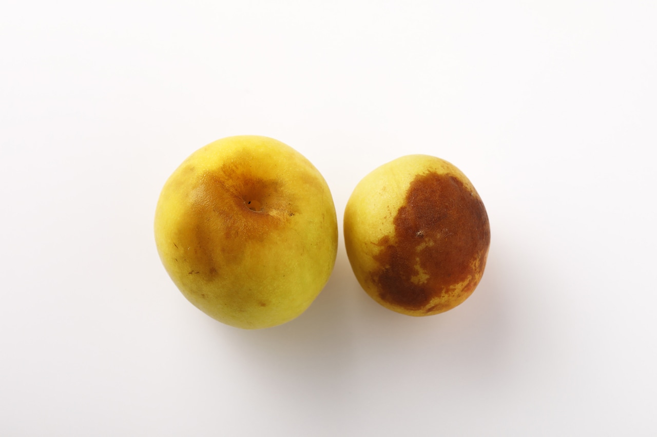 写真右の梅のように茶色い部分が広範囲に広がっている場合は、傷んでいるところを切り落として使いましょう。