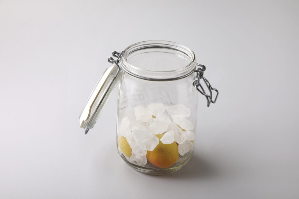 - 梅、氷砂糖、梅、氷砂糖…… と交互にミルフィーユ状になるように詰めていく。ふたをして冷蔵庫で1か月以上漬ける。