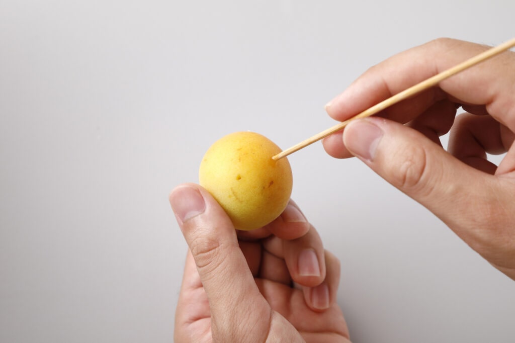 梅を漬ける前に、竹串やつまようじで1粒あたり5か所ほど穴をあけておくと、エキスがでやすくなります。