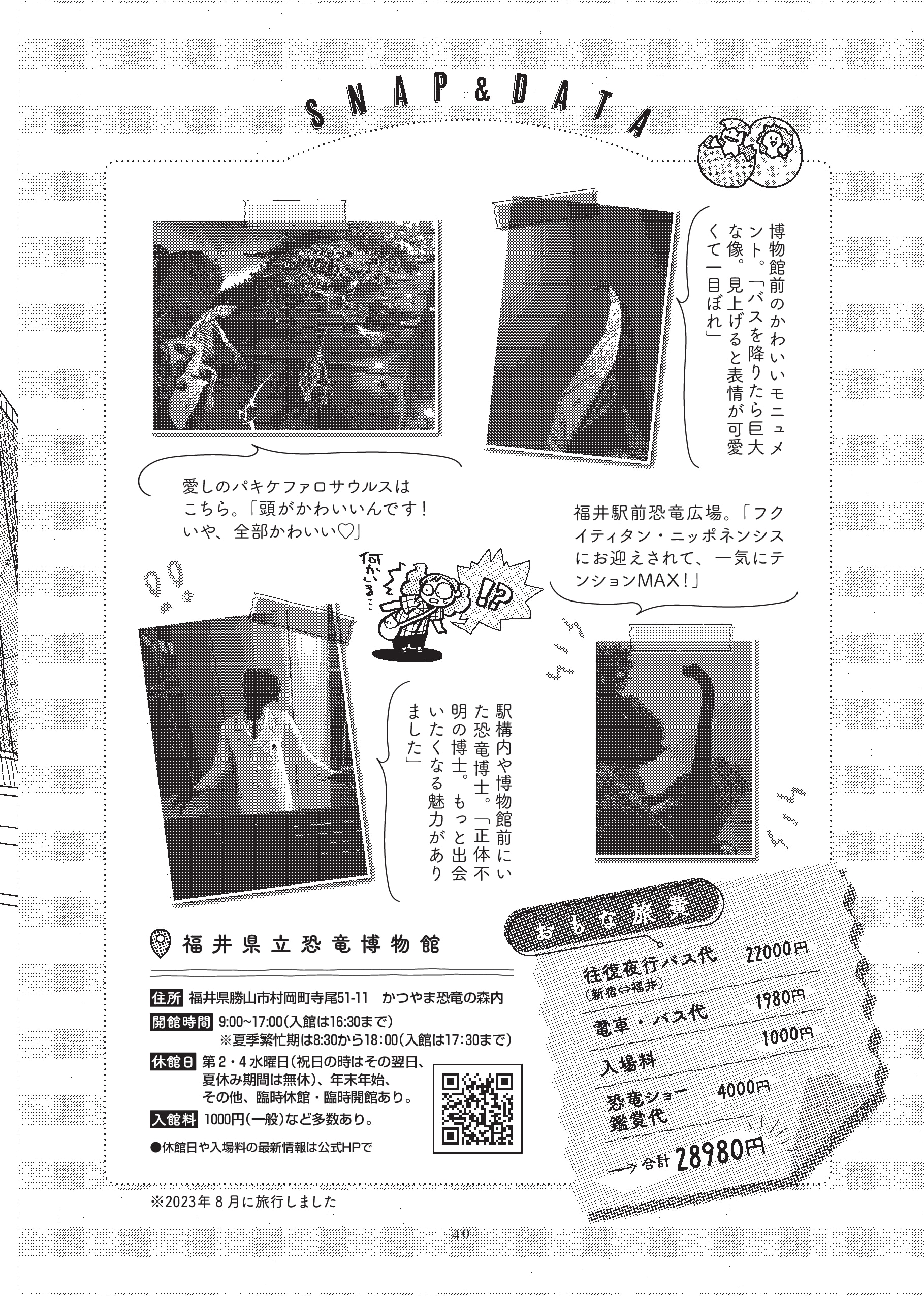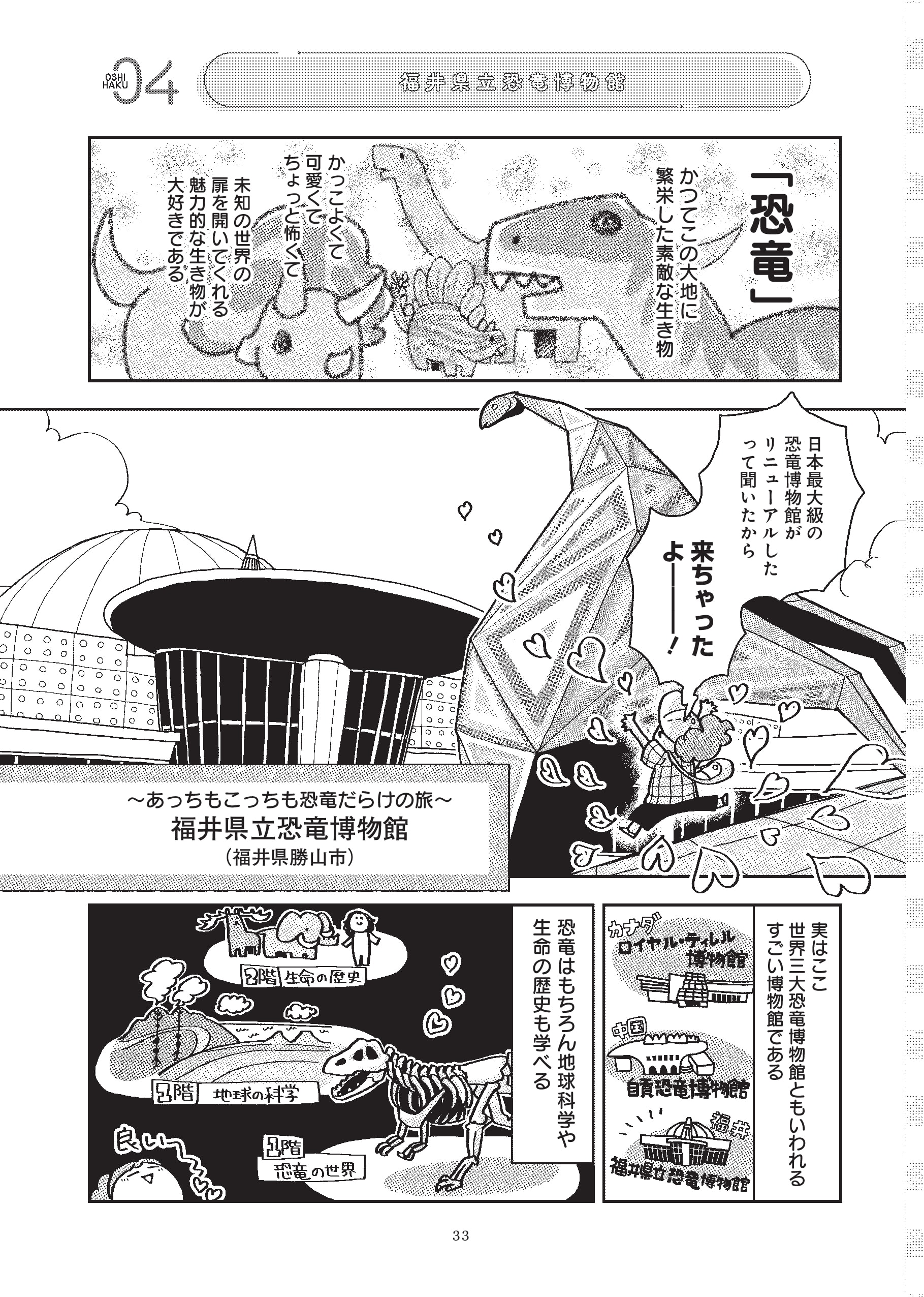 福井県勝山市にある、福井県立恐竜博物館。恐竜に関する資料の多さは国内最大級とも言われ、子どもから大人まで注目度の高い、人気の博物館です。明さんの旅の記録を試し読みで早速チェック!