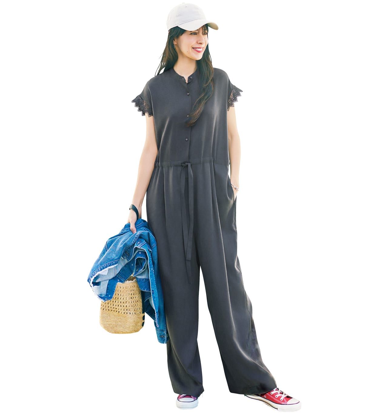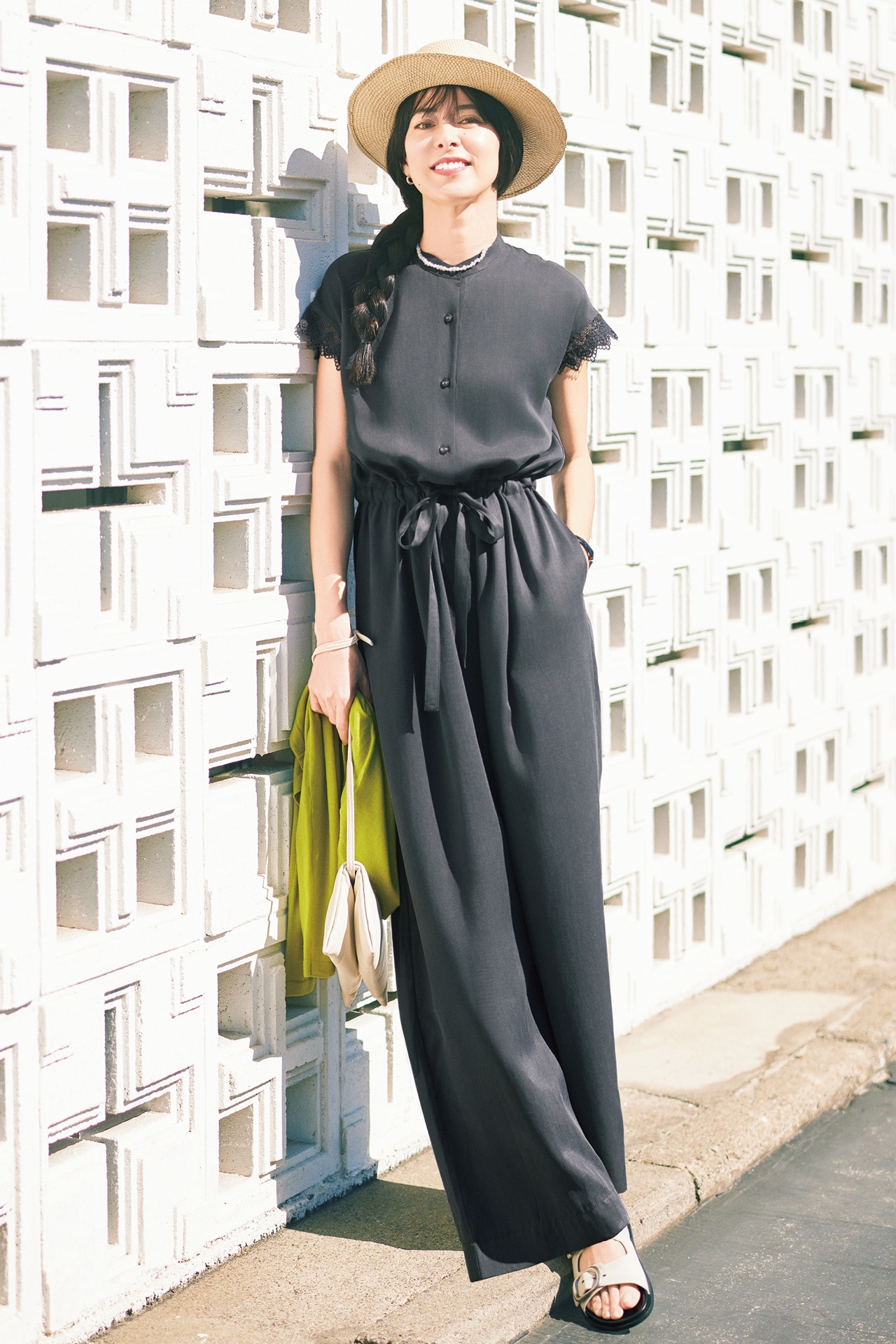 風通しのいい涼やかなオールインワンにレースの袖でほどよい甘さをトッピング