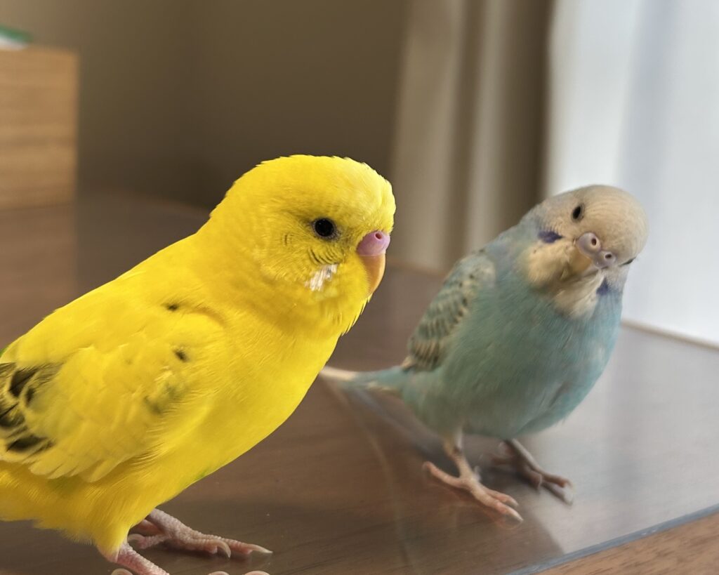 鳥でも性格が全然違って、きいちゃんは人見知りしない、優しくて活発、おしゃべりが大好き。あおちゃんはおっとりしていて人見知りで気が強く食いしん坊(もしかして女の子!?)。あおちゃんはきいちゃんが大好きなのに近づくと威嚇するツンデレな性格です(笑)。そんな2羽を見ていると面白くて幸せな気持ちになります。