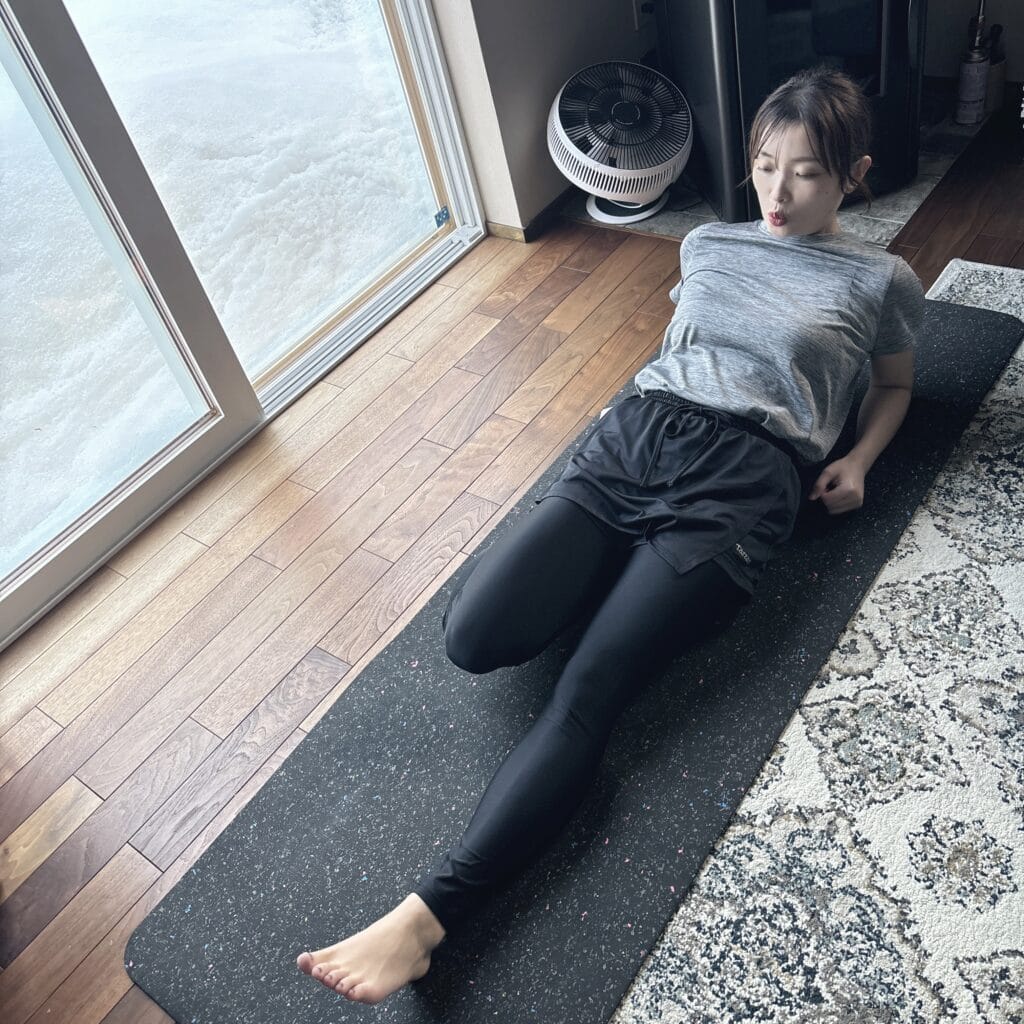 「簡単なエクササイズを開始。私がトライしたのは本誌に掲載されている呼吸筋トレと姿勢矯正エクササイズ4種類。呼吸筋トレは日中気付いた時に取り入れるようにして、姿勢矯正エクササイズは朝と晩、余裕があれば日中に1回くらい。簡単なのですぐ終わるよ!」