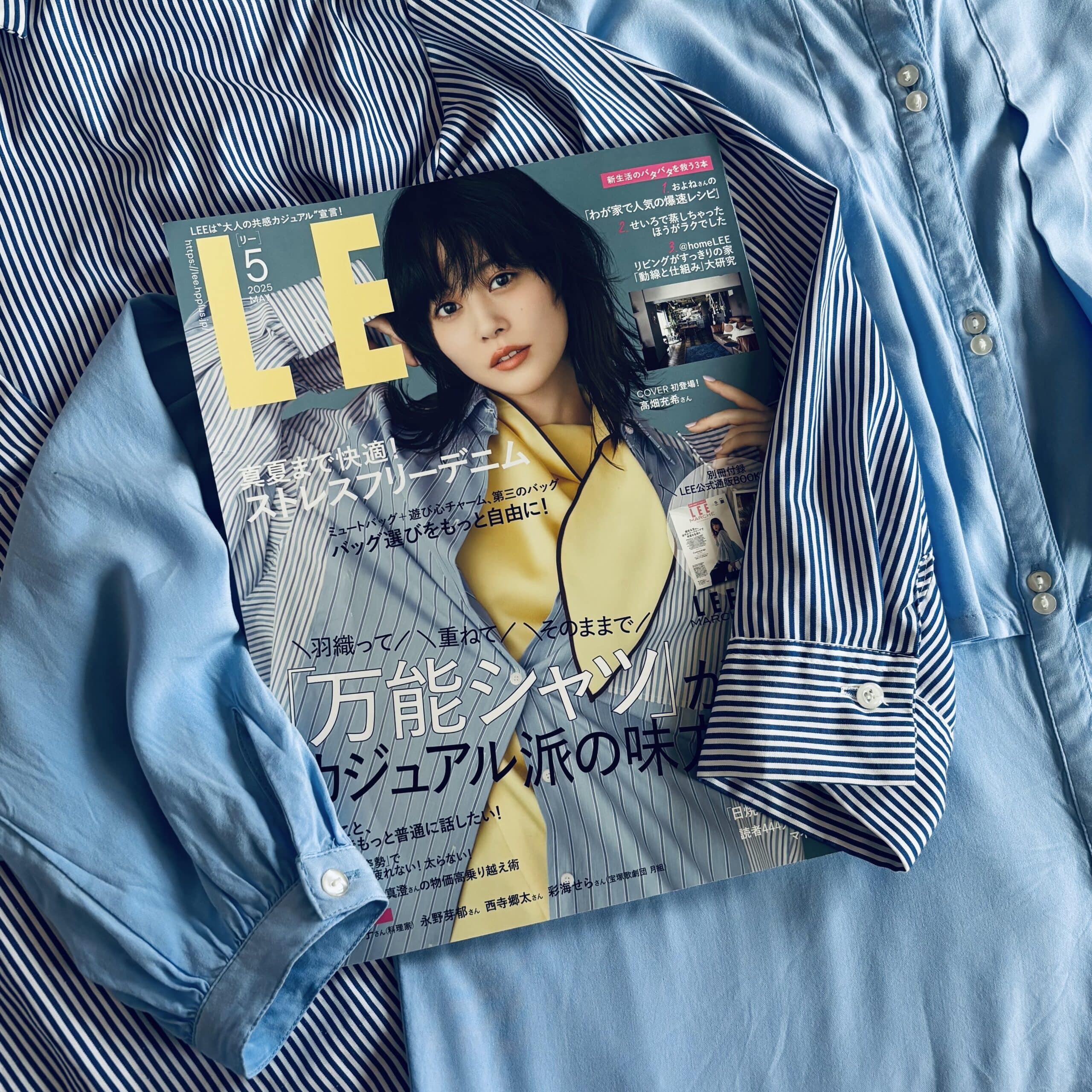 「LEE5月号の注目は、何といっても『「万能シャツ」がカジュアル派の味方です!』。ブルーストライプシャツのコーデが満載♡
