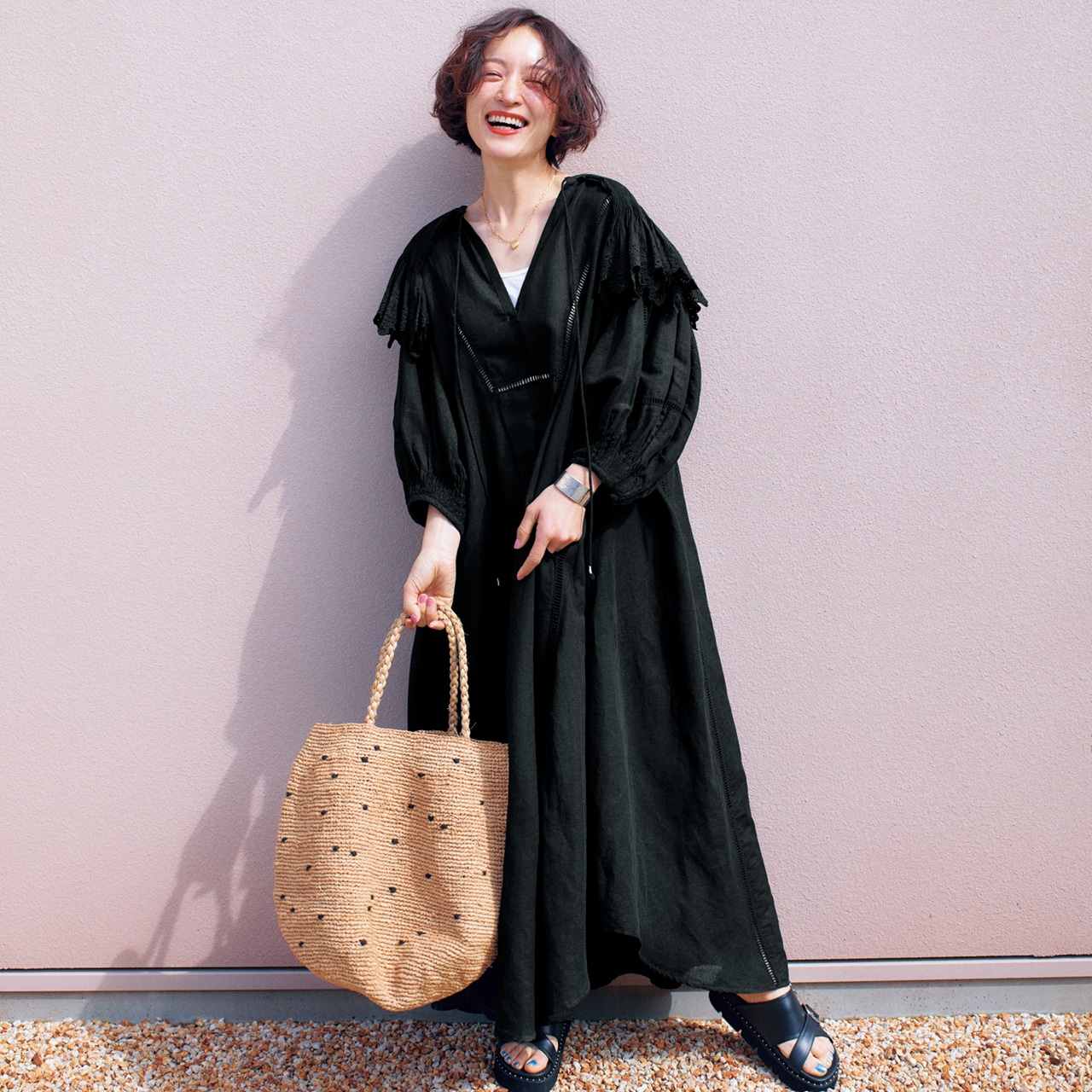 カレンソロジーは普段からよくお買い物をしているブランド。クラフト感のあるアイテムが可愛いですが、中でも今季は大人ガーリーな雰囲気で着られそうなこのワンピースに一目惚れしました。ディテールが甘めだからこそ、私はあえてピリッと締まる「黒」をセレクト。一枚ではもちろん、デニムやTシャツと重ねてもいいし、秋冬ならタイツやタートルを仕込んでもOK! 一年中大活躍してくれる、定番アイテムとなりそうです。
