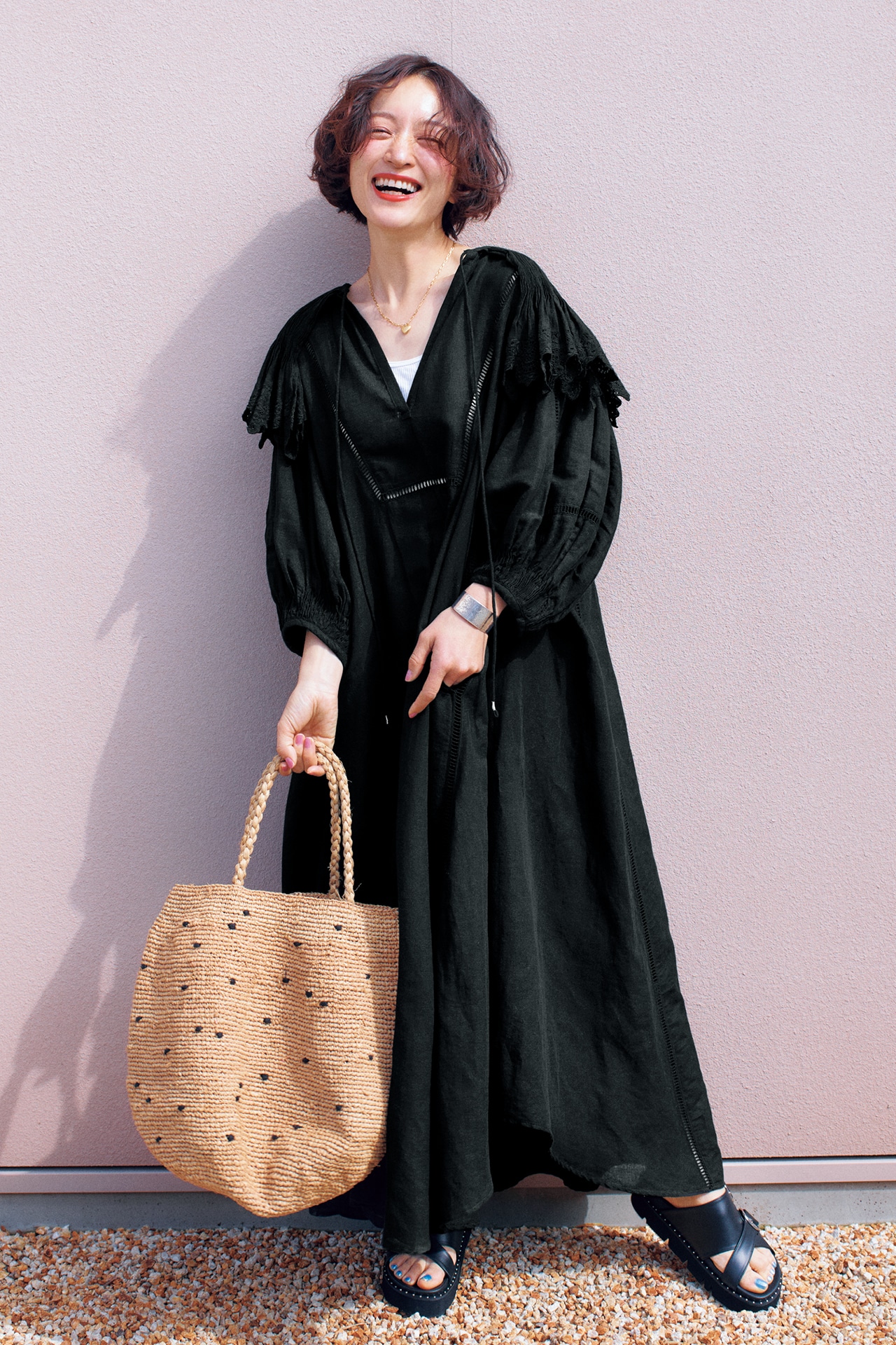 ふわっと広がりリラクシーなムードが漂うワンピース。ぽてっとしたサンダルやスニーカーといったラフな足元で、気負わず楽しむのが都さん流。