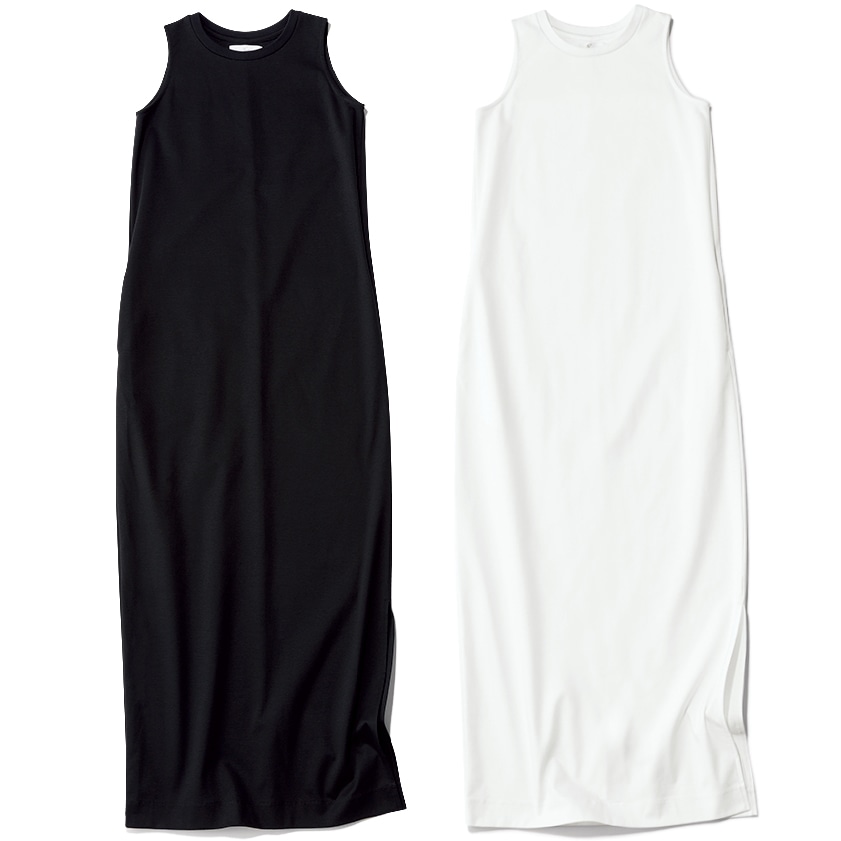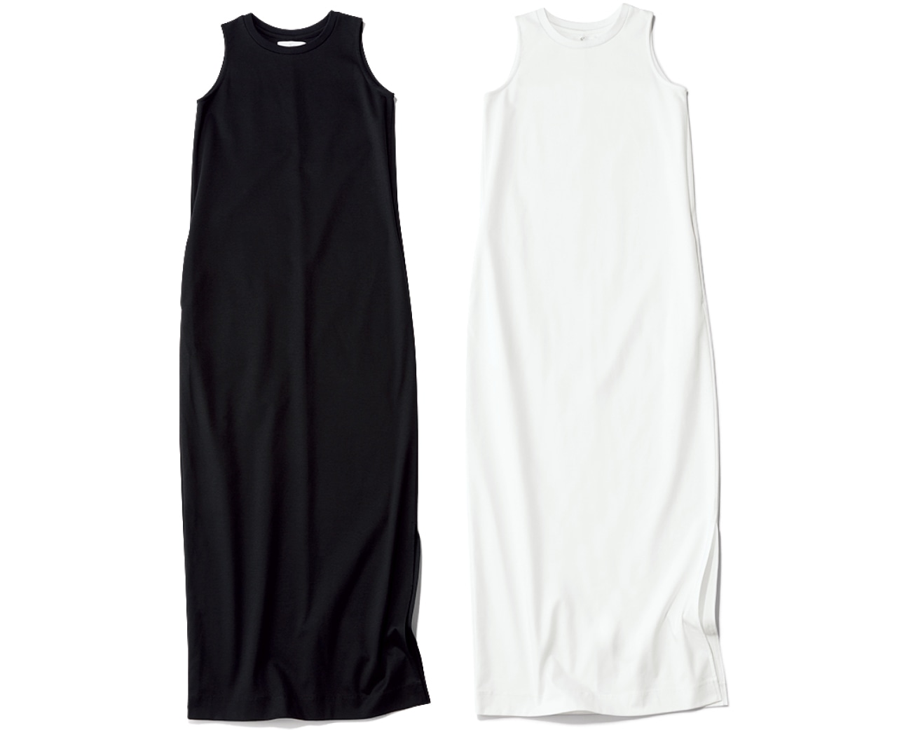 「小物を替えてきれいめに着たり、ボトムと重ねたりと着回し自在! 足さばきをよくするため、片側にだけ深いスリットを入れました」(浅見さん)。ほどよく厚地で型崩れしにくいハイゲージのポンチ素材を使ったシンプルなカットソーワンピ。腕がすっきり見える幅広アメスリと足首まですっぽりのマキシ丈にこだわりました。身長に合わせて2丈から選んで。