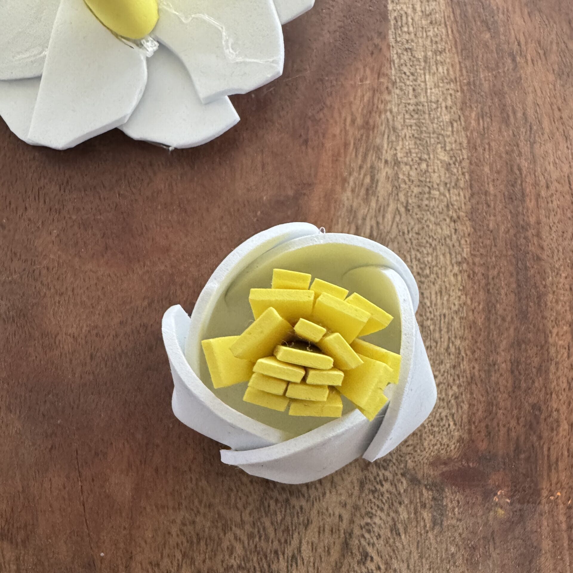 「フォームシートもお花にしてみました。フォームシートをお花の形に切って、放射状に中心に向かって切り込みを入れます。切り込みを畳むように隣の花びらとくっつけます。お花型のカップができたら真ん中にヒラヒラさせたいフォームシートを貼り付けました。