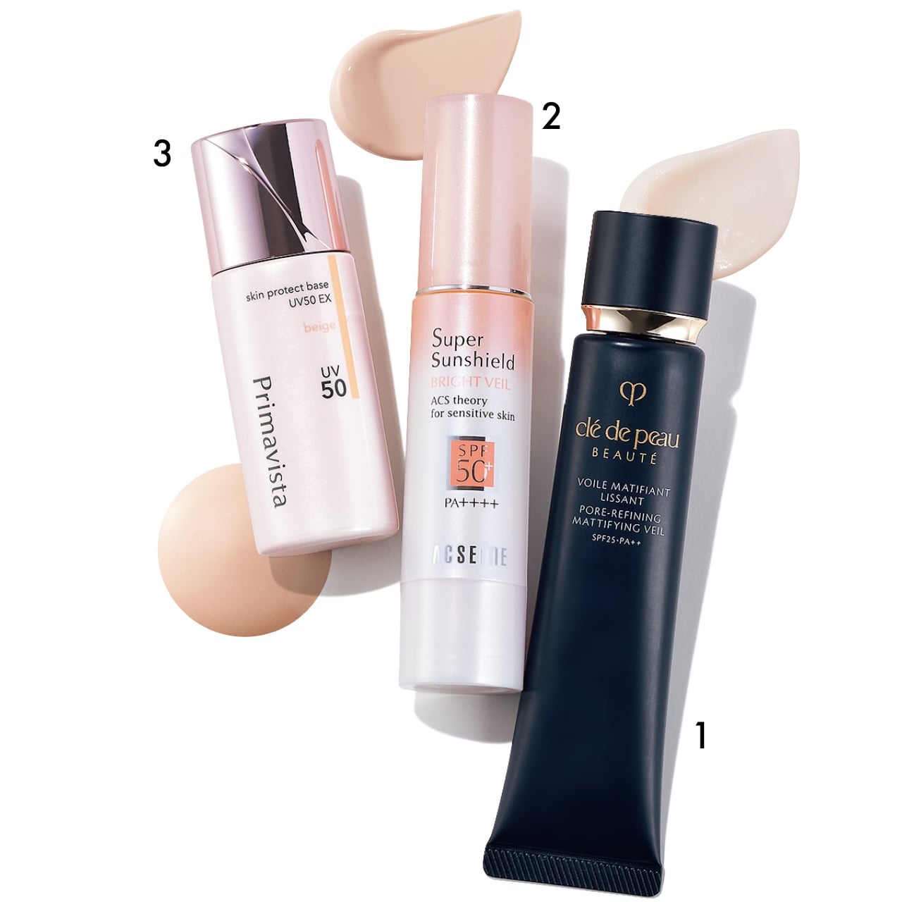 「ファンデだけで完璧にカバーしようとすると、どうしても厚塗りになってしまうので、まずは総合的に肌をランクアップしてくれる下地で底上げを。「あっ、変わった」とうれしい実感のあるもの選びが正解です。日焼け止めを塗る感覚で、顔や首に漏れなくなじませて。くすみや毛穴、肌の凹凸、色ムラなどのコントロールができて、重ねるファンデが薄く済むので、結果的に自分の素材を生かした肌づくりができますよ」