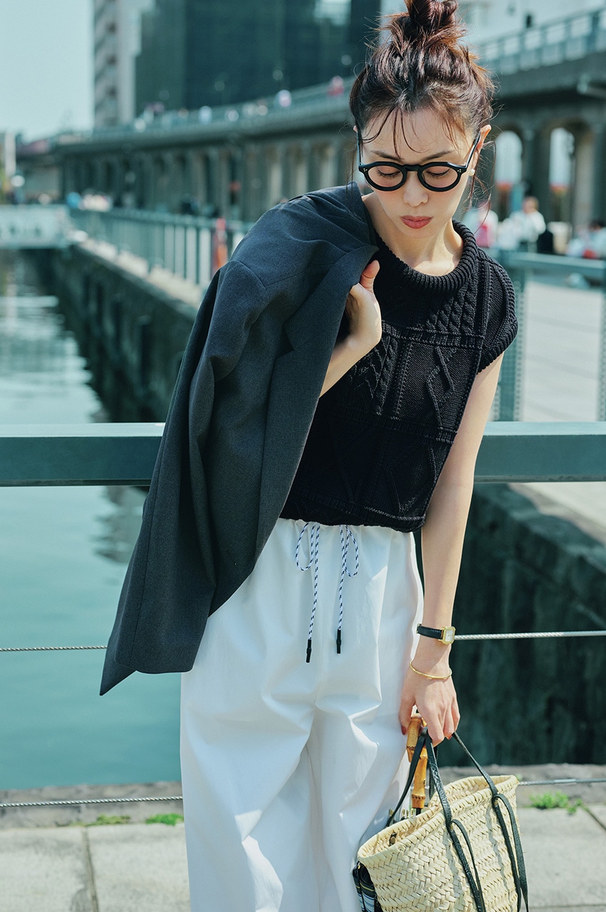 「トップスの、〝前だけイン〞をすることで、パンツコーデのバランスはぐっと美しくなります。シャカパンやスウェットパンツなど、ベルトループのないドロスト仕様のパンツにはとても有効。ぜひ、実践してみてください」